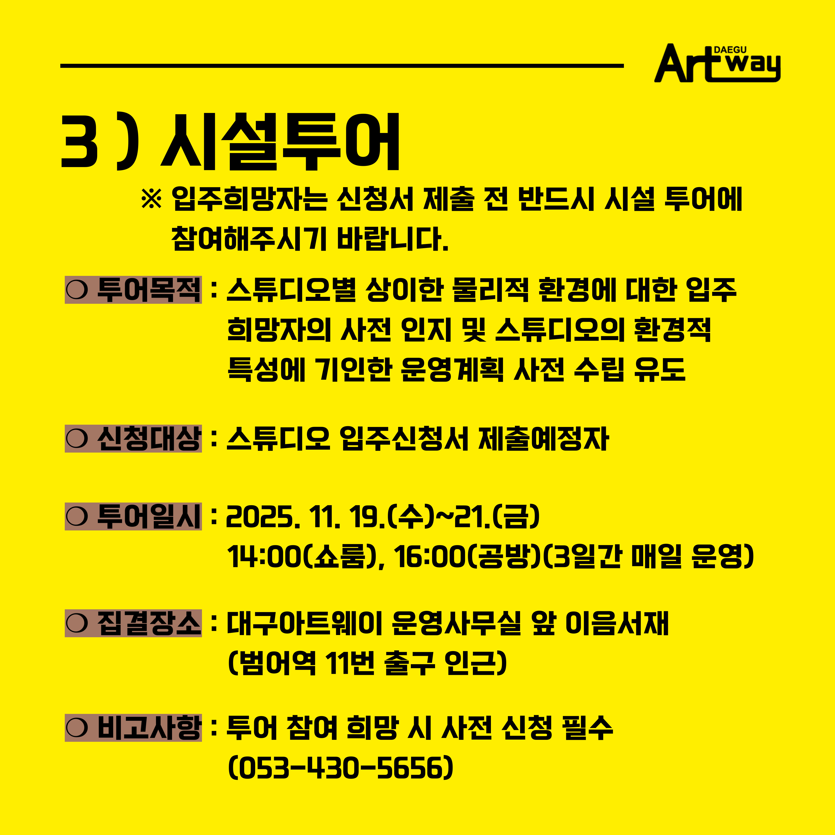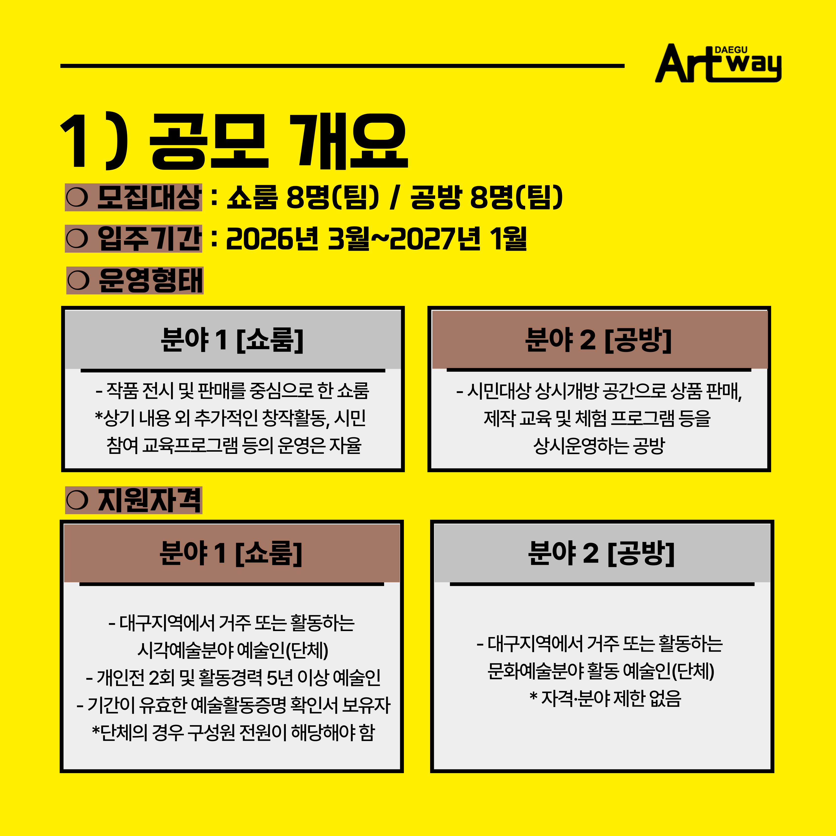 2026 대구아트웨이 스튜디오 입주예술인(단체) 모집작성자 : 장명운 작성일 : 25-11-12