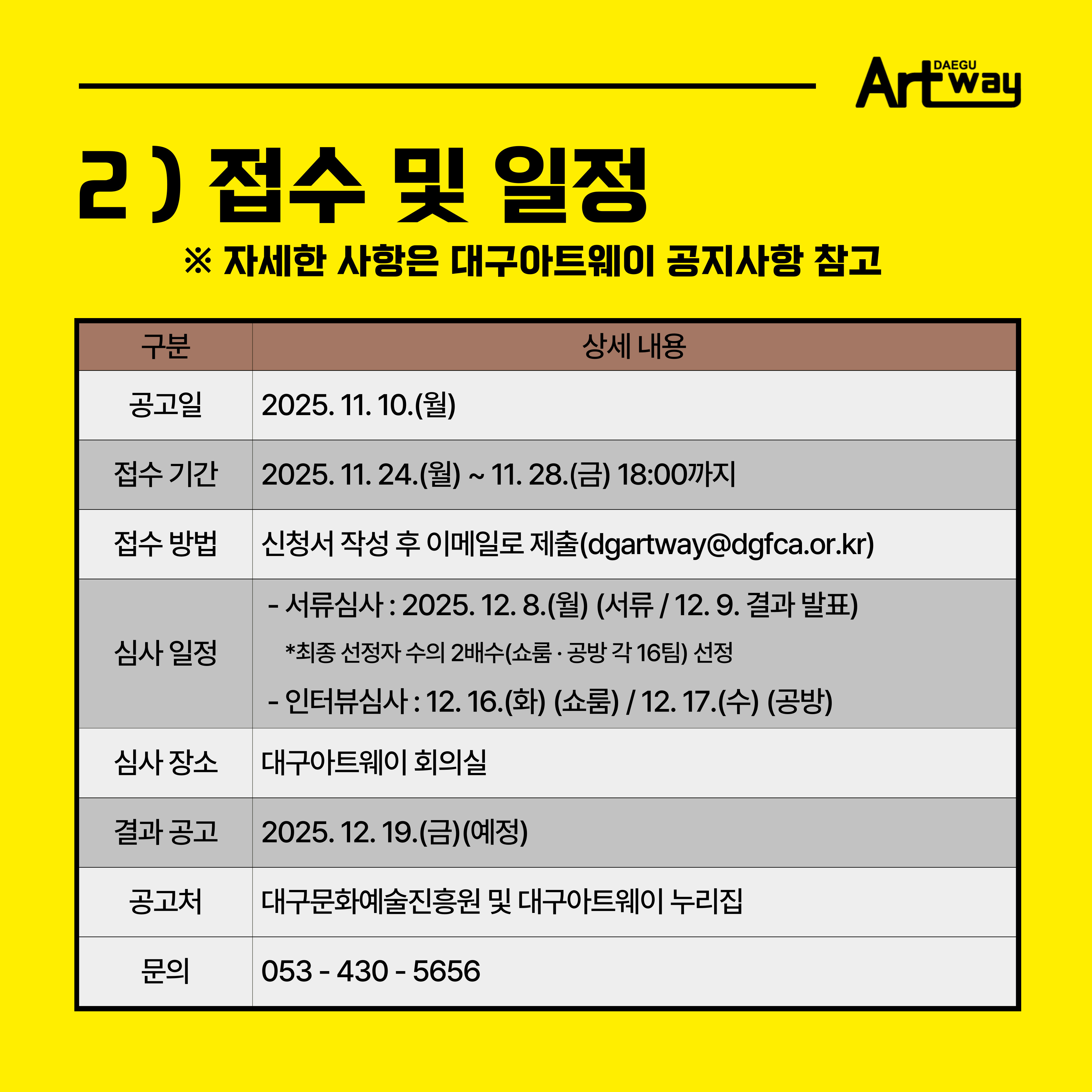 공모 요강은 대구문화예술진흥원(https://dgfca.or.kr) 및 대구아트웨이(https://dgartway.kr) 누리집 내 공고문을