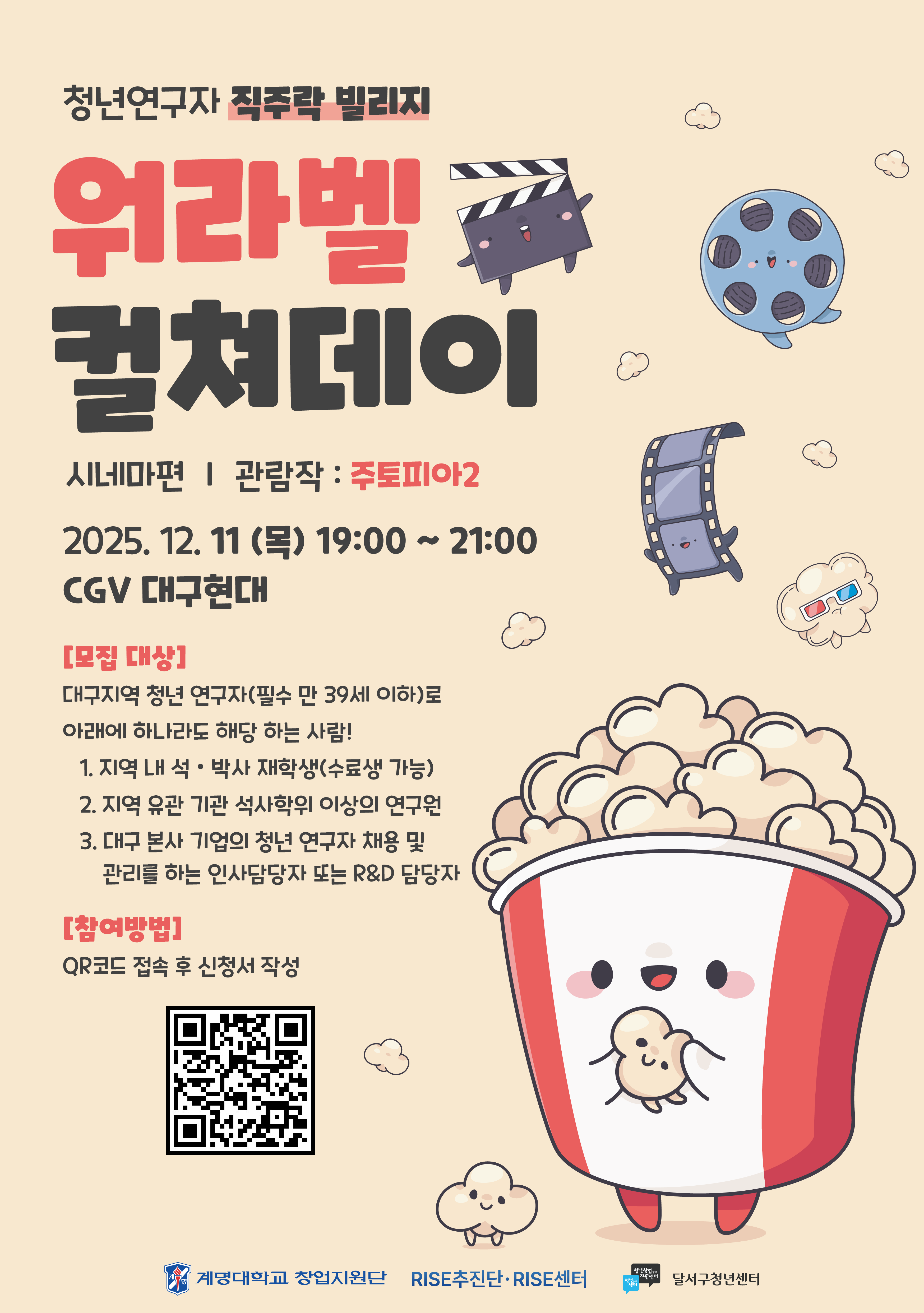 [계명대학교 창업지원단] ‘청년연구자 직주락 빌리지’ 워라벨 컬쳐데이 안내작성자 : 이준혁 작성일 : 25-12-05