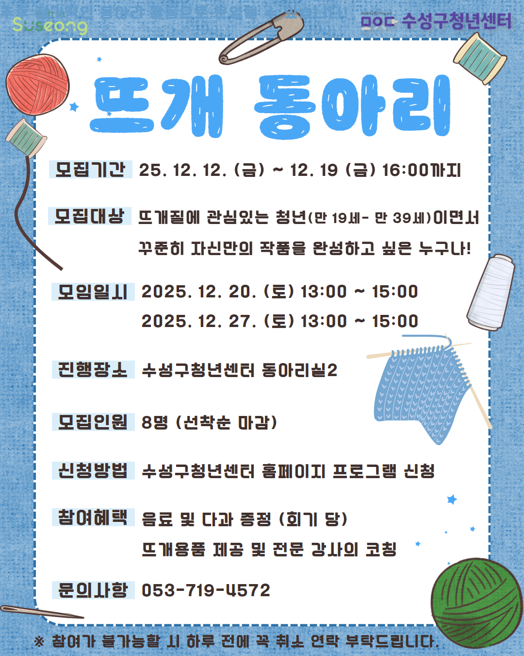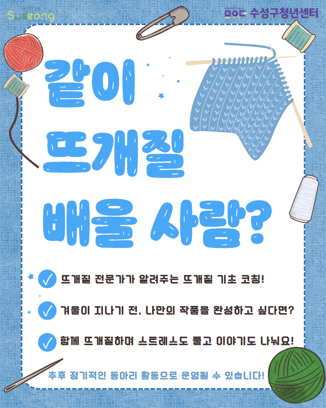 🔊 수성구청년센터에서 청년 모임을 위해 뜨개 동아리를 개설하였습니다!