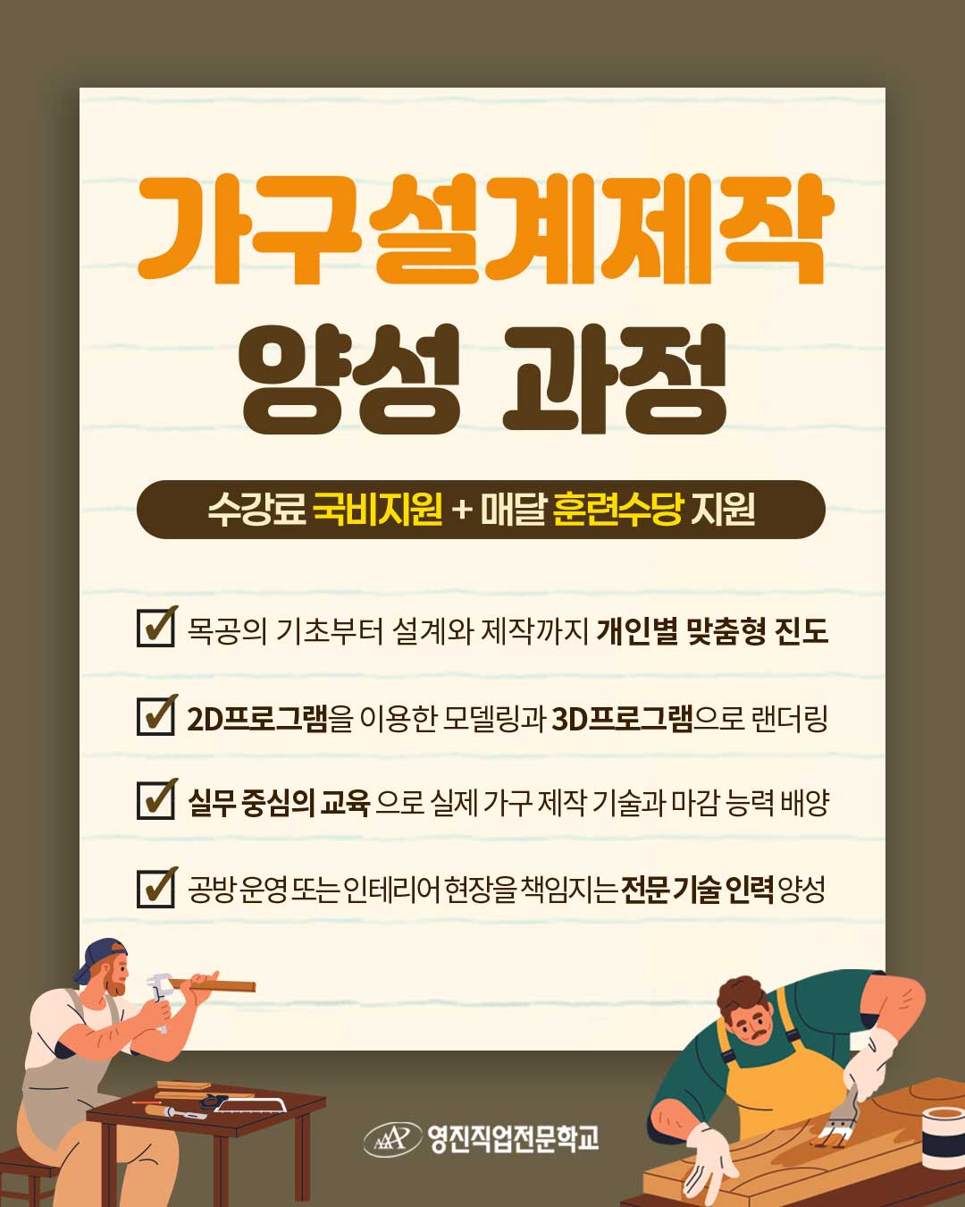 가구를 제작 및 시공하고 CNC자동화 기계와 레이저를 활용한 다양한 목제품을 만드는 기술을 배양하는 과정입니다