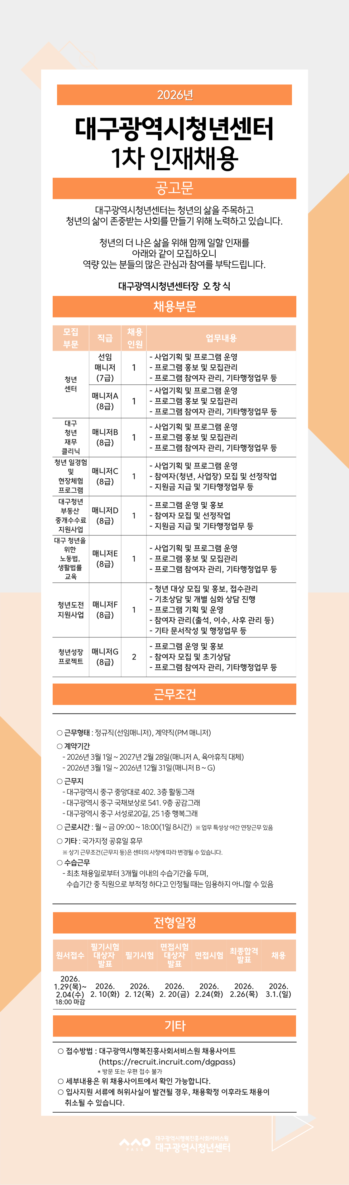 대구광역시 청년센터 인재채용 공고작성자 : 대구청년센터 작성일 : 26-01-23 대구광역시청년센터
