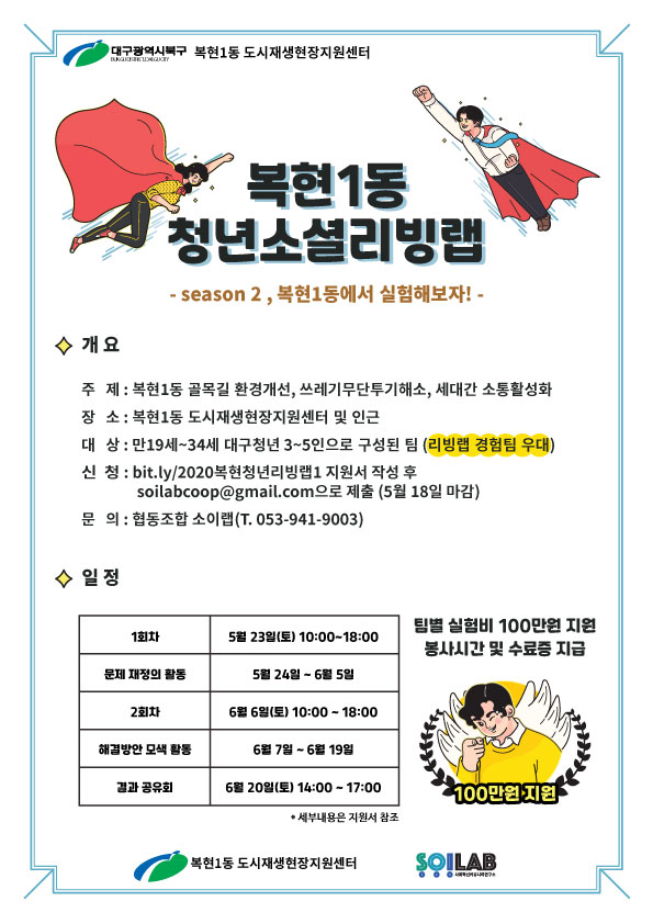 더 통큰 실험비 지원과 더 넓은 주제로 돌아온 복현1동 리빙랩에 여러분들의 많은 관심과 참여부탁드립니다.