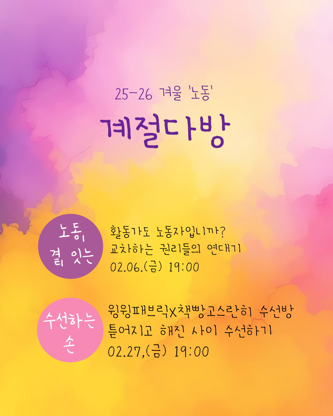 이번 겨울에는 다양한 노동의 풍경에 대해서 이야기를 나눠보려고 합니다. 첫 번째 시간에는 왜 노동조합이 필요한지, 노동권이 우리 삶을 어떻게 바꾸는지, 노동권과 동물권은 어떻게 만나는지, 활동가의 노동자성은 어떻게 이해하면 좋을지,동물권행동 카라 노동조합의 현 상황은 어떤지 이야기를 들어보고요, 두 번째 시간에는, 조금 다른 결로, 직접 손을 움직여 변화를 만들어가는 노동의 즐거움, 관계의 회복 등에 대해서 이야기를 나누어 보려고 해요.