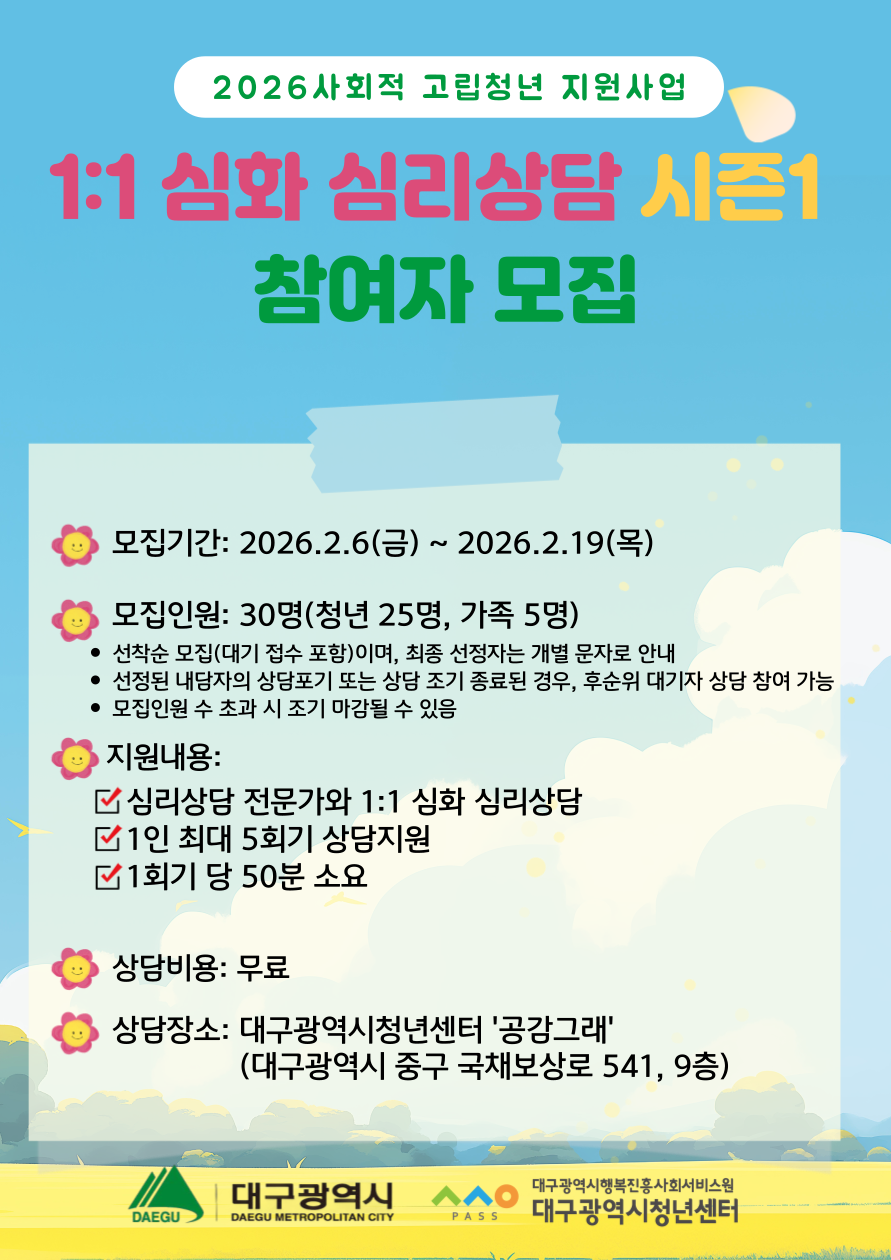 2026 사회적 고립청년 지원사업 <1:1 심화 심리상담 시즌1> 참여자 모집작성자 : 대구청년센터 작성일 : 26-02-06 대구광역시청년센터