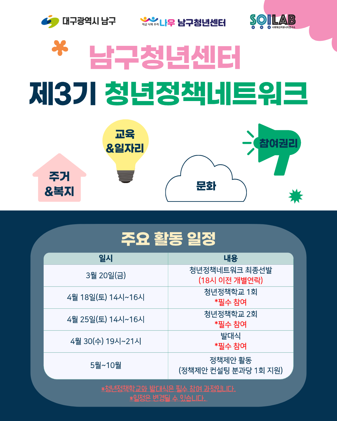 📢 제3기 남구청년정책네트워크 참여자 모집작성자 : 이민지 작성일 : 26-02-13