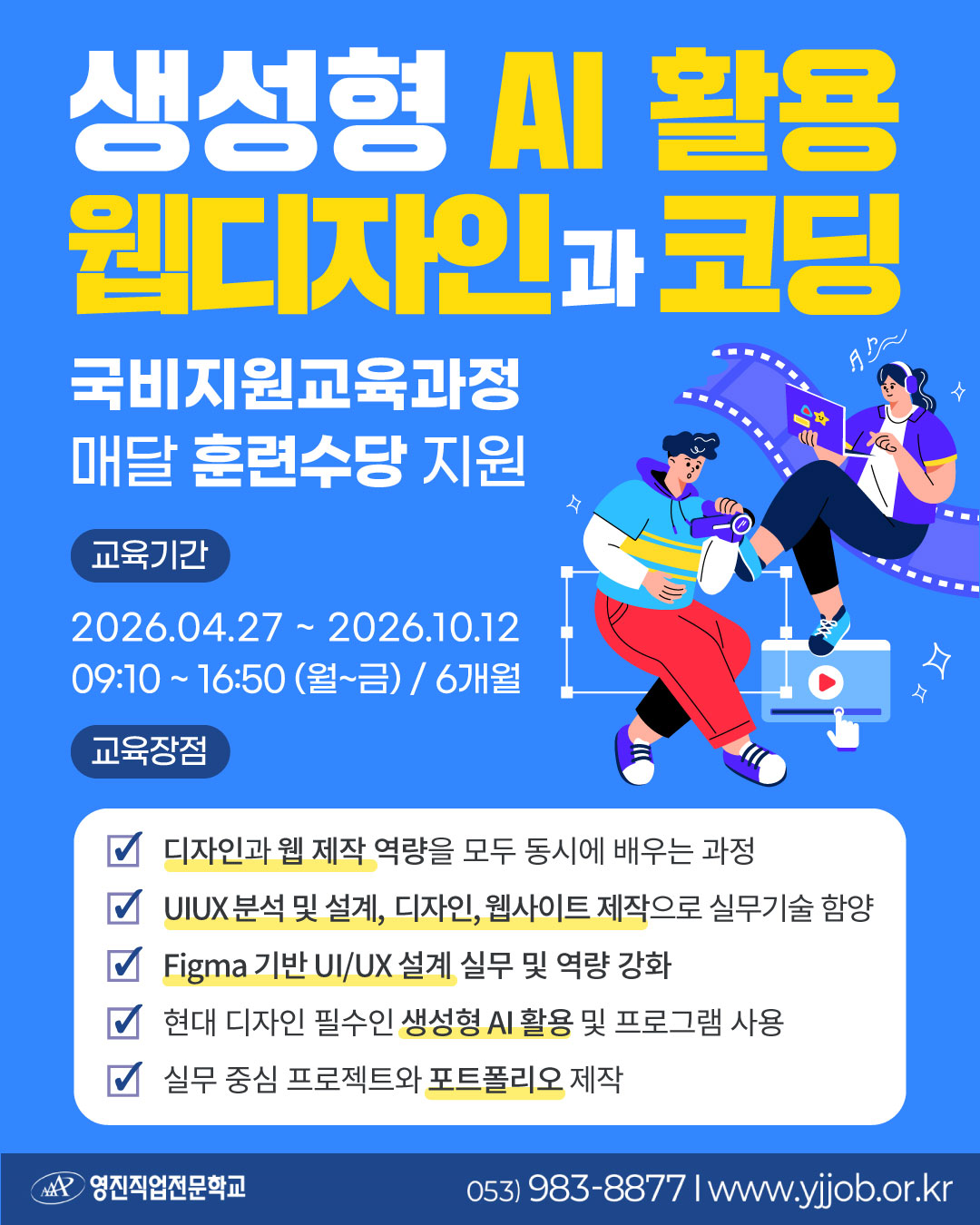 특히 최신 AI 프로그램을 적극 활용하여 기획·디자인·퍼블리싱·웹 구현까지 전 과정을 효율적으로 수행하는 방법을 배우며, 빠르게 변화하는 디지털 환경에 대응할 수 있는 경쟁력을 갖추게 됩니다.