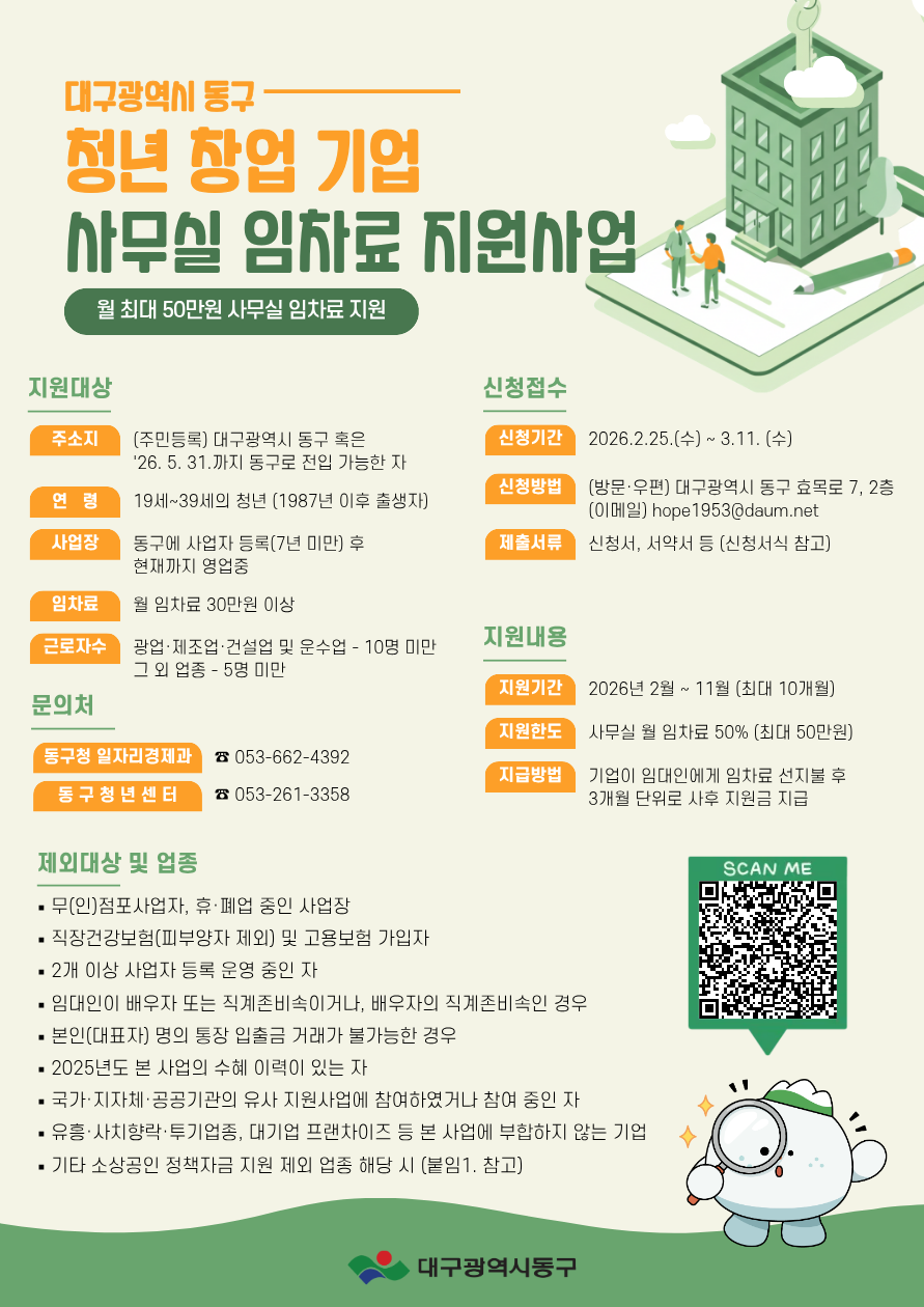 대구광역시 동구 관내 청년 창업자의 사업장 임차료 부담을 경감하여 안정적인 창업 환경을 제공하고자,「2026년 청년 창업기업 사무실 임차료 지원사업」 참여자 모집을 다음과 같이 공고합니다.
