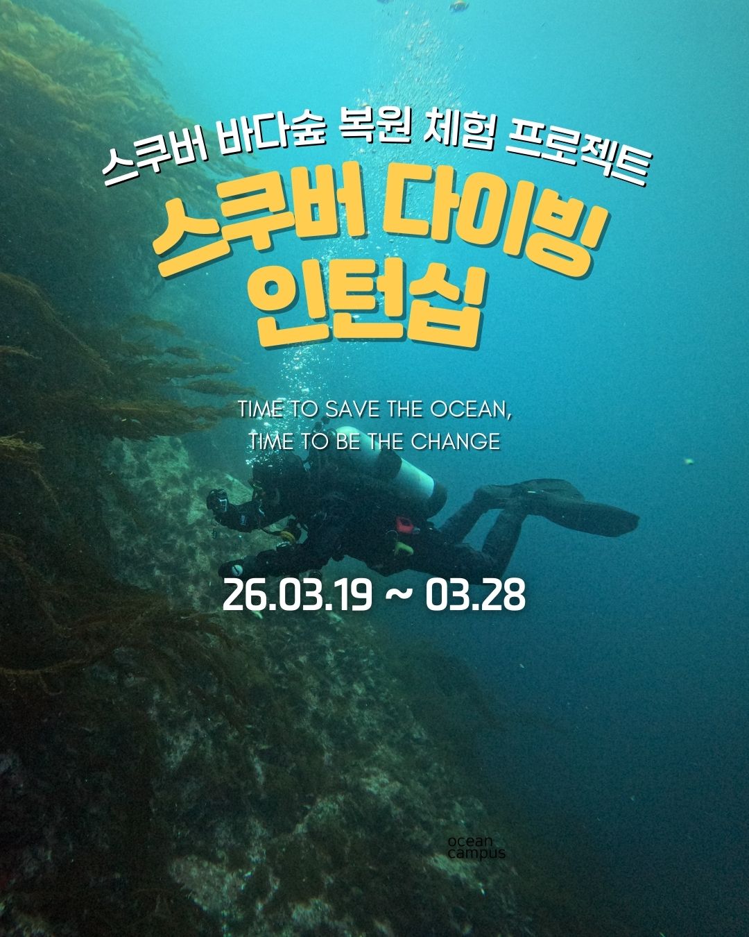 스쿠버 다이빙으로 바다숲 복원 현장에 직접 참여하는 10일간의 특별한 인턴십 프로그램, 오캠십일에 여러분을 초대합니다.