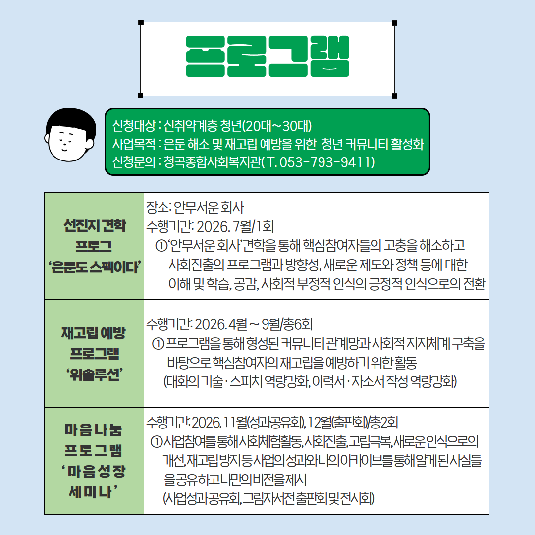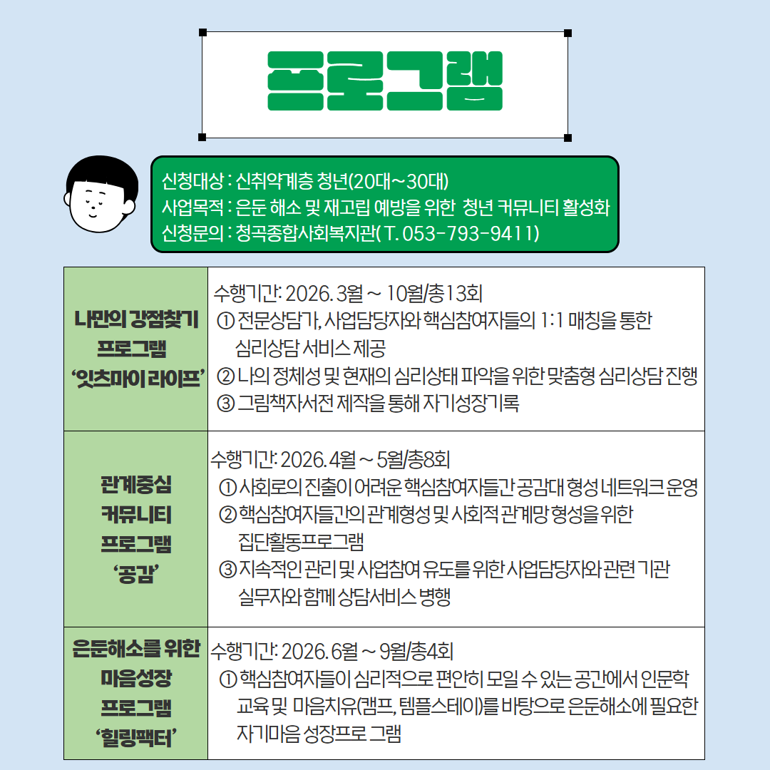 각 사업의 정보 및 신청 등 사업·프로그램 문의는 게시글 내 담당기관으로 문의 바랍니다.