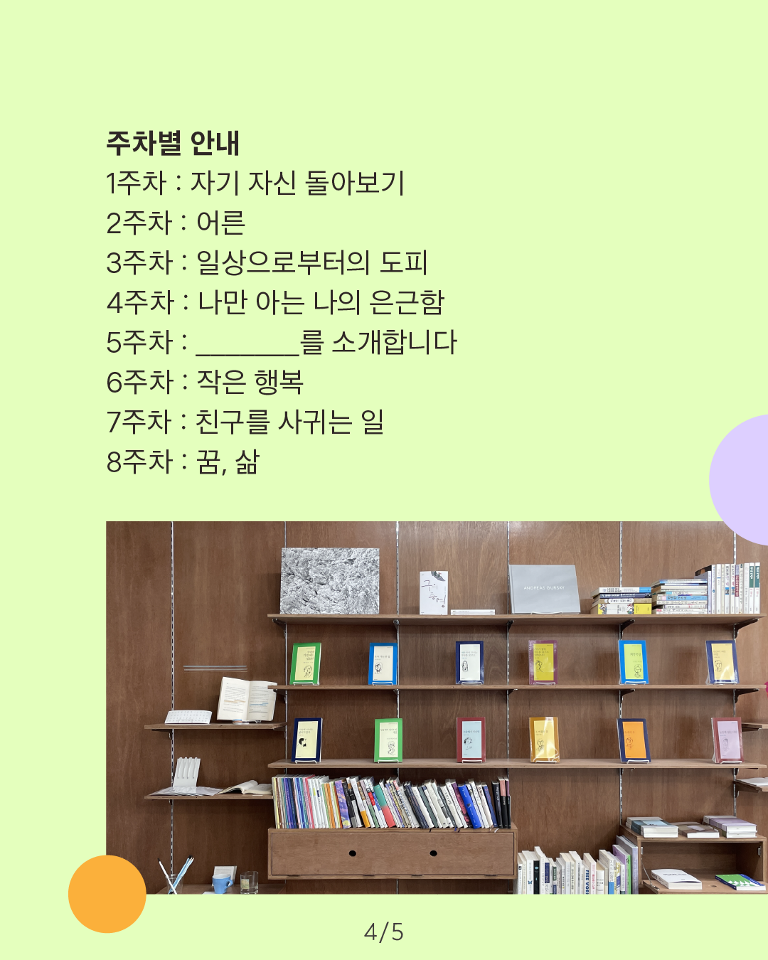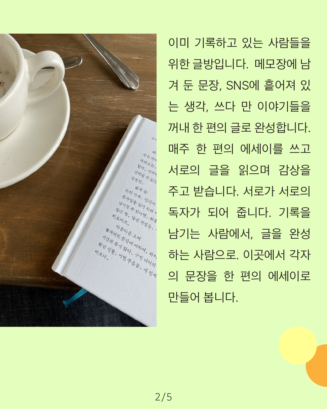 ❶. 이미 기록하고 있는 사람들을 위한 글방입니다. 메모장에 남 겨 둔 문장, SNS에 흩어져 있 는 생각, 쓰다 만 이야기들을 꺼내 한 편의 글로 완성합니다. 매주 한 편의 에세이를 쓰고 서로의 글을 읽으며 감상을 주고 받습니다. 서로가 서로의 독자가 되어 줍니다. 기록을 남기는 사람에서, 글을 완성 하는 사람으로. 이곳에서 각자 의 문장을 한 편의 에세이로 만들어 봅니다.