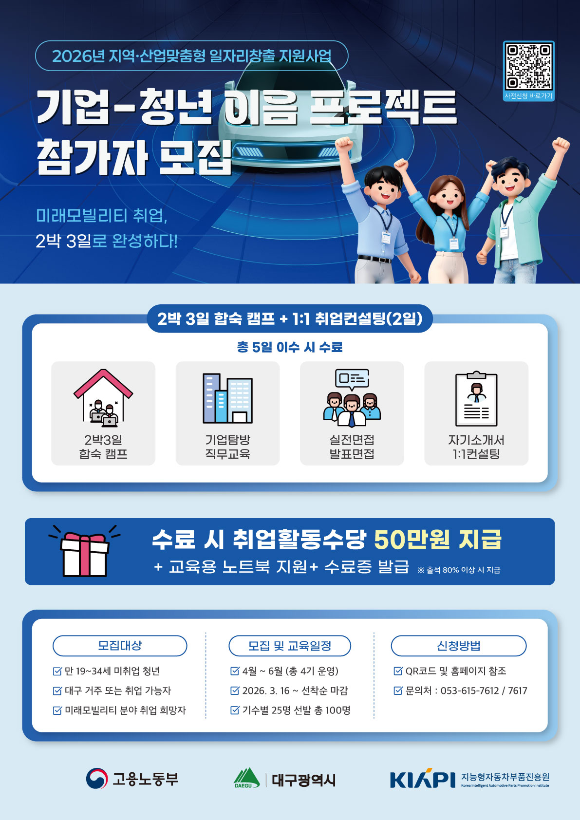 고용노동부와 대구광역시가 지원하는 「2026년 기업-청년 이음 프로젝트」 참가자를 모집합니다.