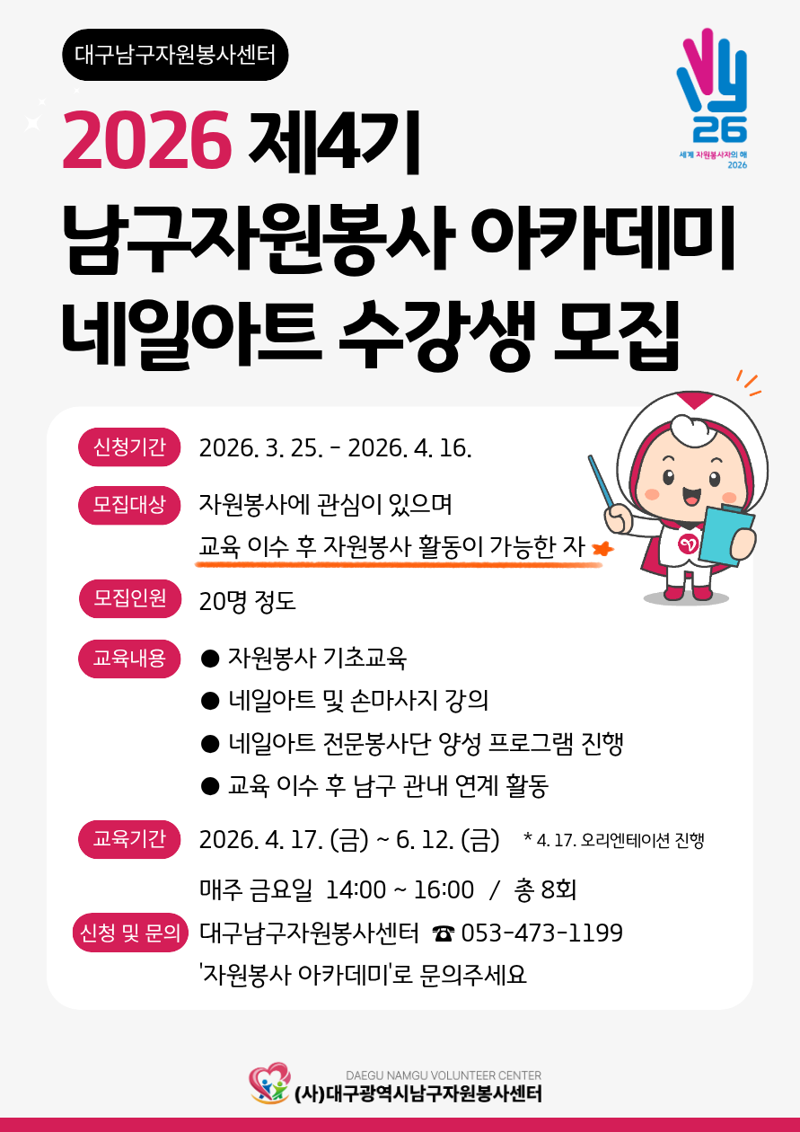 2026 남구자원봉사 아카데미 네일아트 수강생 모집작성자 : 박태준 작성일 : 26-03-26