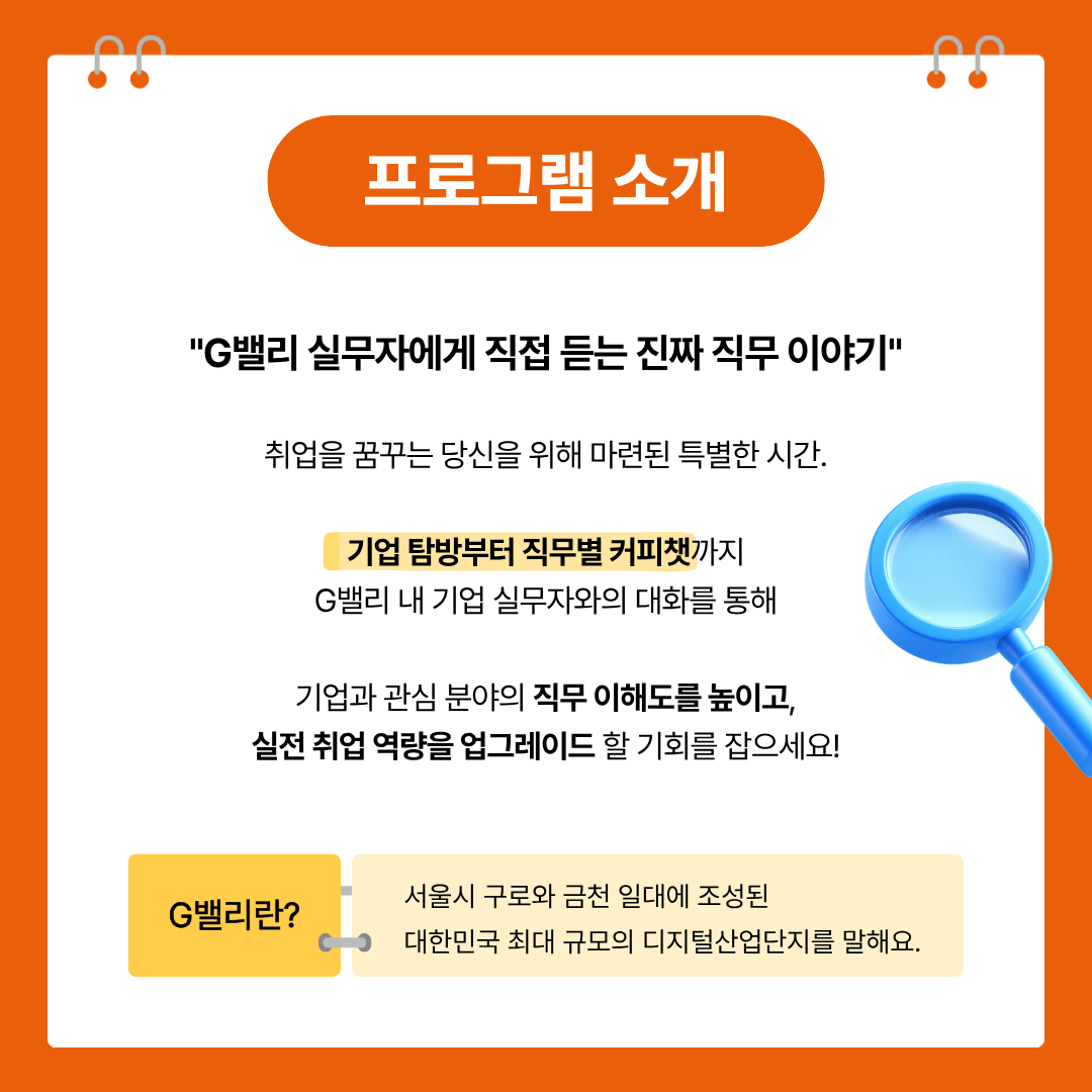 G밸리 내 기업 탐방부터 직무별 실무자와의 커피챗까지.