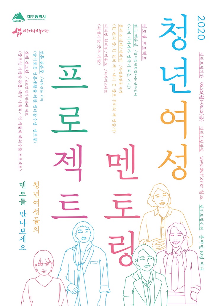 대구시는 지역에서 활발하게 활동하고 있는 여성 멘토와 청년 여성을 연결함으로써 지역 여성들의 세대를 뛰어넘는 소통을 시작하려고 합니다. 청년 여성들에게 새로운 꿈이 되고, 멘토들에게는 지역에서 희망을 발견할 수 있는 계기가 될「2020 청년여성 멘토링 프로젝트」 사업의 청년 여성 멘티를 공모하오니 많은 참여 바랍니다.