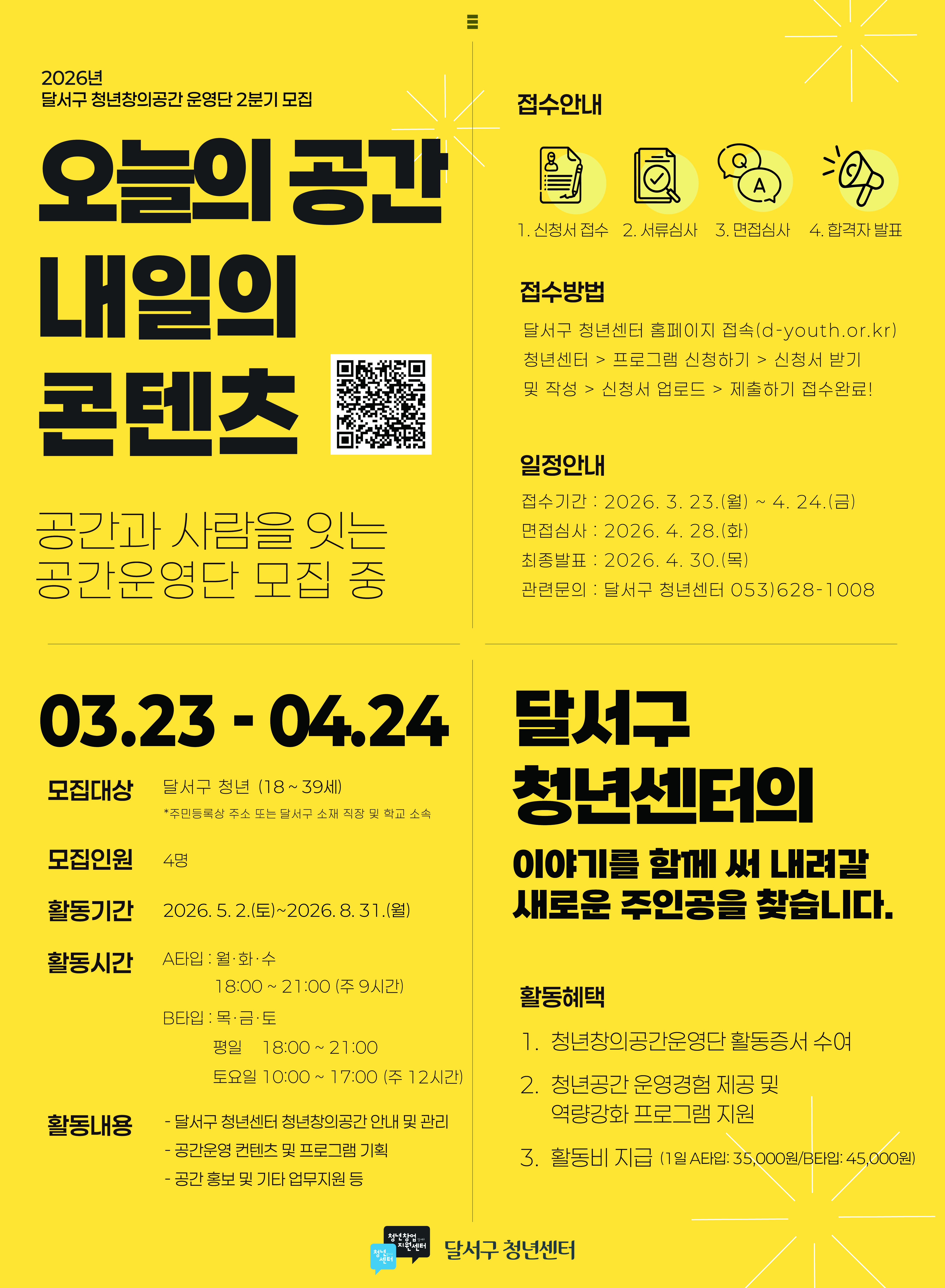 2026년 달서구 청년센터 청년창의공간 운영단 모집작성자 : 이승진 작성일 : 26-04-09