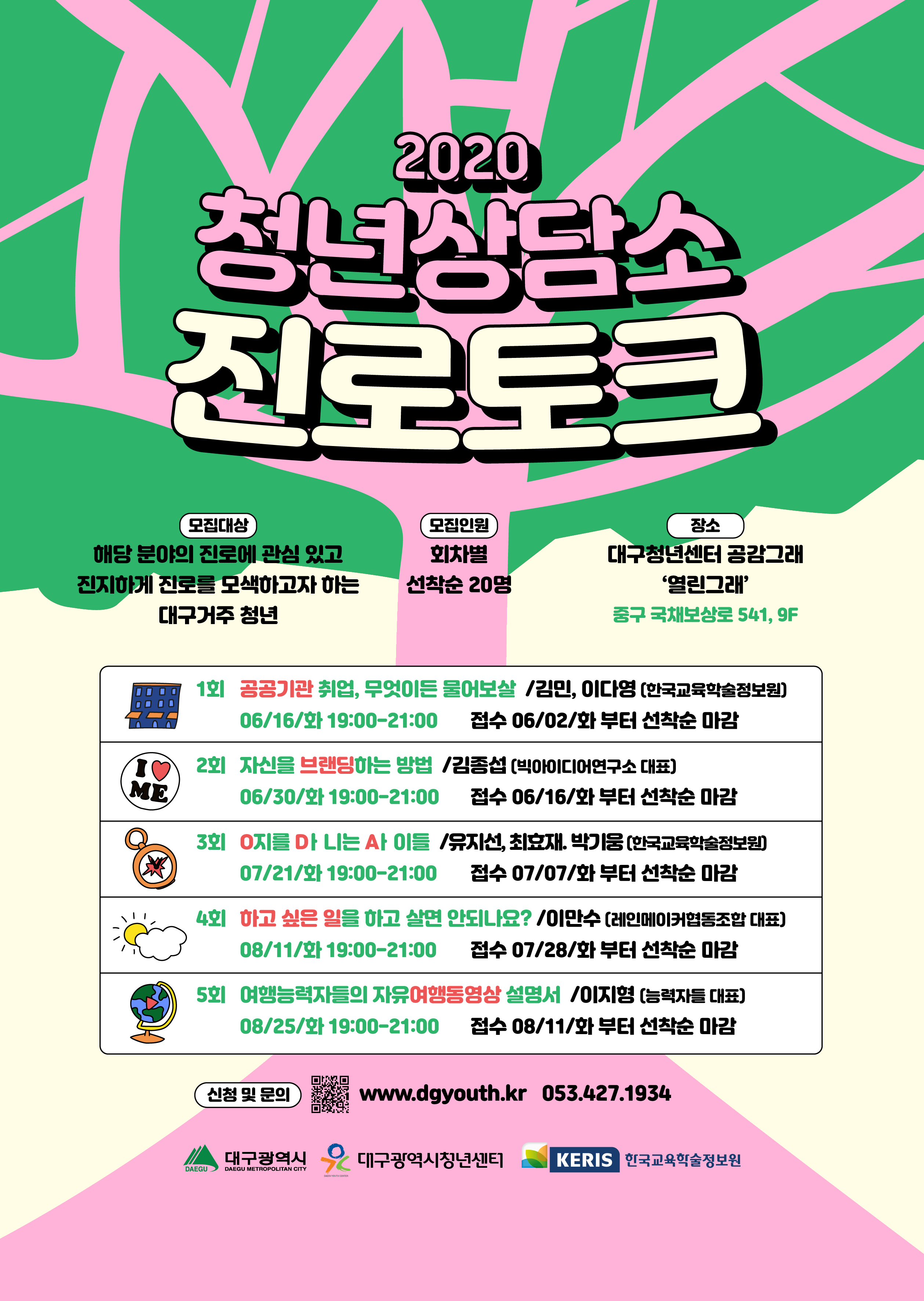 2020 청년상담소 진로토크 참여 모집작성자 : 젊프 작성일 : 20-06-03 대구광역시청년센터