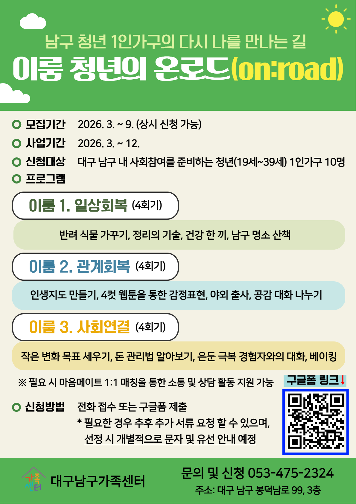 남구 청년 1인가구의 일상·사회적 관계망 회복 프로그램 '이룸 청년의 온로드(on:road)' 참여자 모집작성자 : 김지현 작성일 : 26-04-14