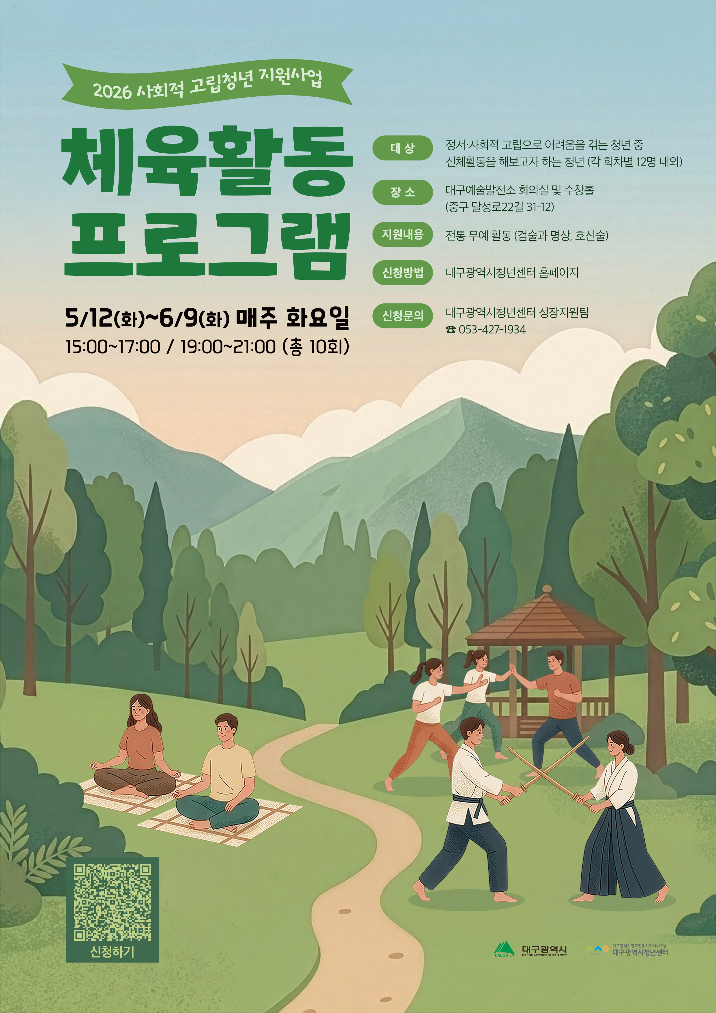 2026 사회적 고립청년 지원사업 <체육활동 프로그램> 참여자 모집작성자 : 대구청년센터 작성일 : 26-04-20 대구광역시청년센터