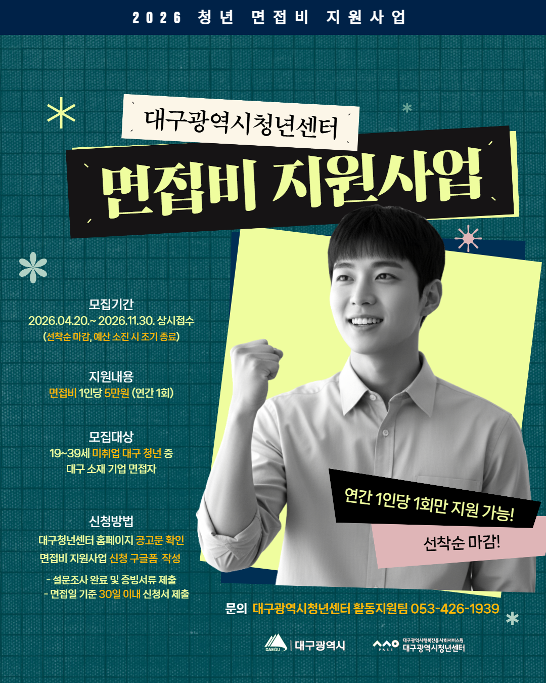 대구 소재 기업에 면접을 본 19-39세 청년을 대상으로 1인 1회 5만원을 지원합니다.