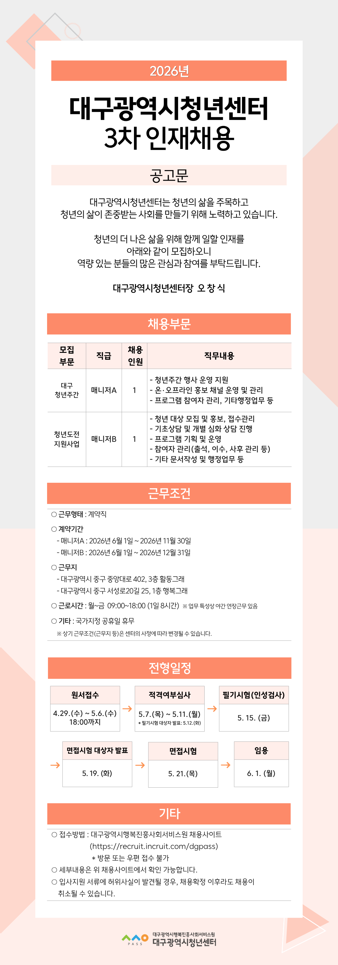[제2026-03호] 대구광역시청년센터 인재채용 공고작성자 : 대구청년센터 작성일 : 26-04-24 대구광역시청년센터