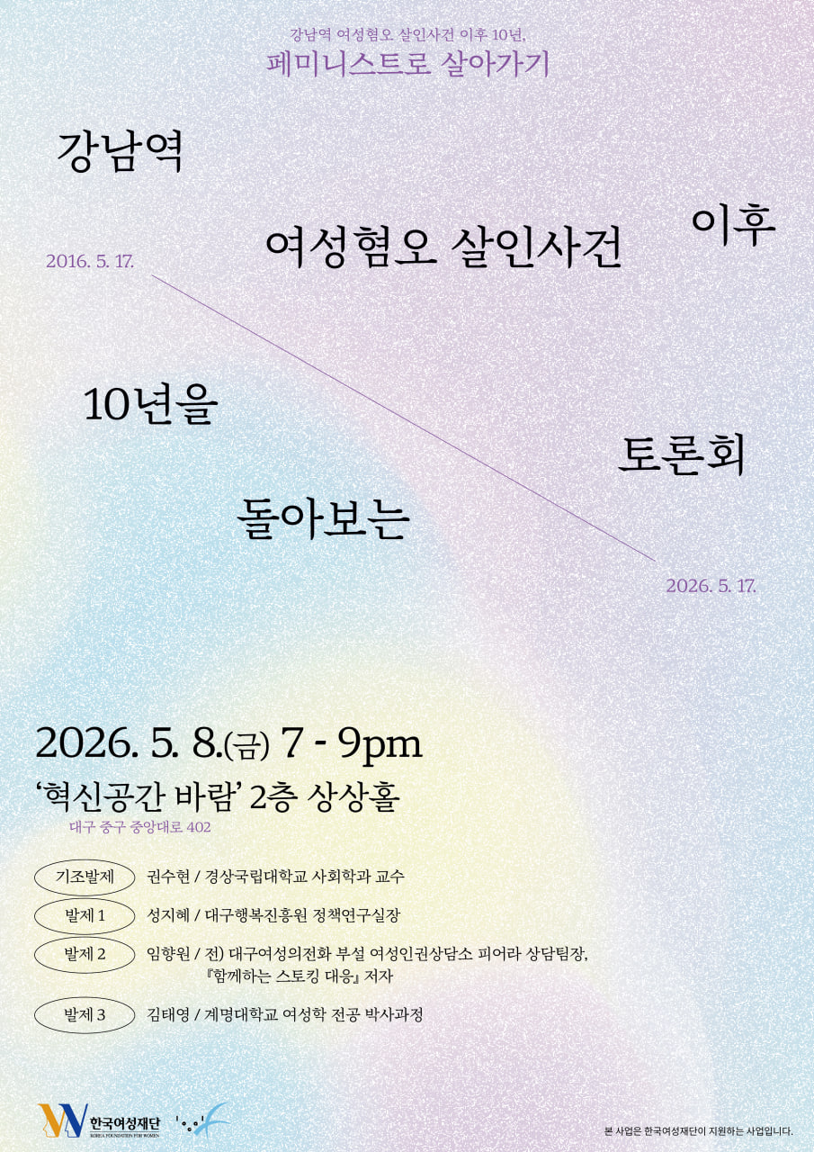 <강남역 여성혐오 살인사건 이후 10년을 돌아보는 토론회>작성자 : 김민정 작성일 : 26-04-29