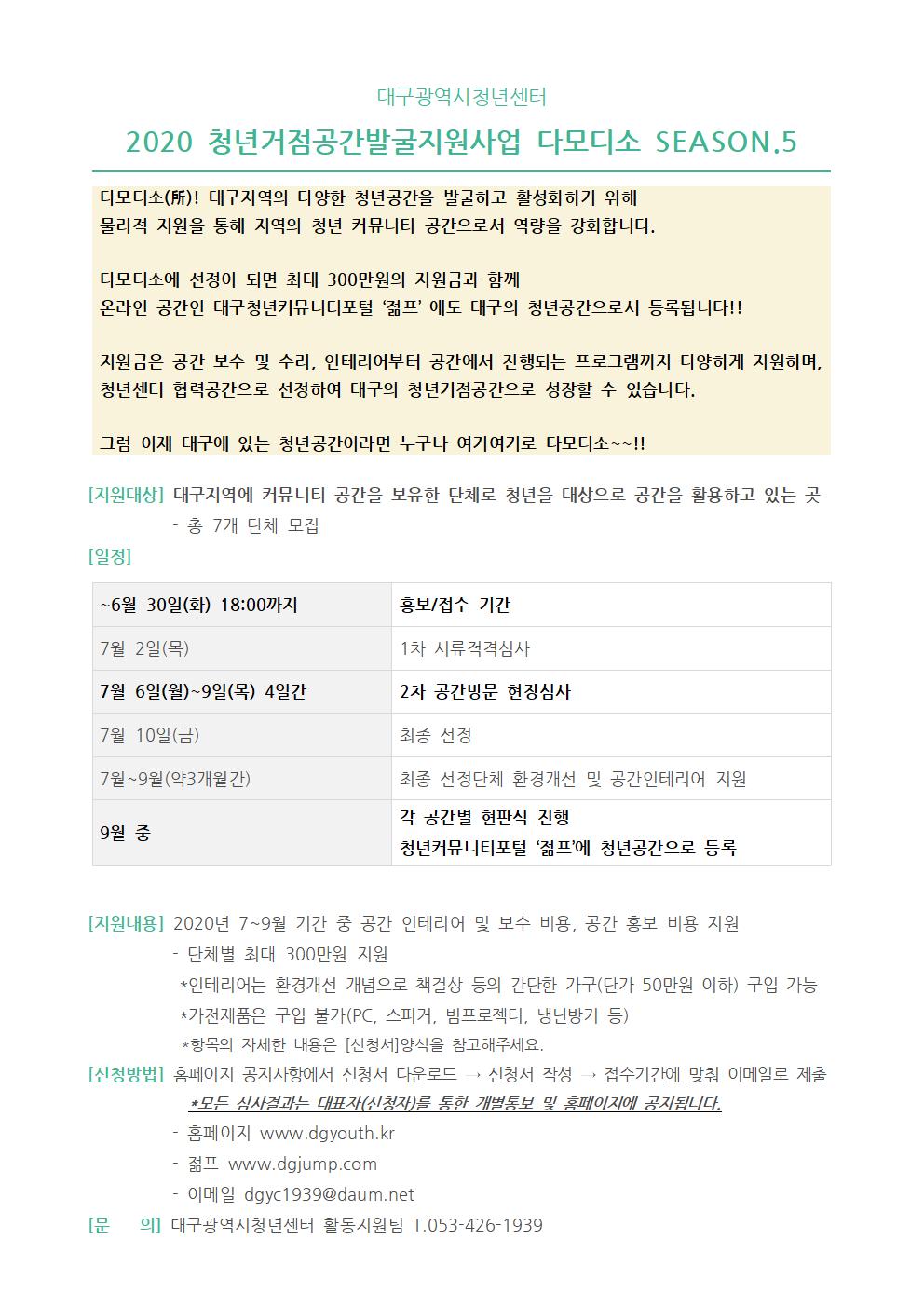 2020 청년거점공간발굴프로젝트 <다모디소 시즌5> 모집공고작성자 : 관리자 작성일 : 20-06-08 대구광역시청년센터