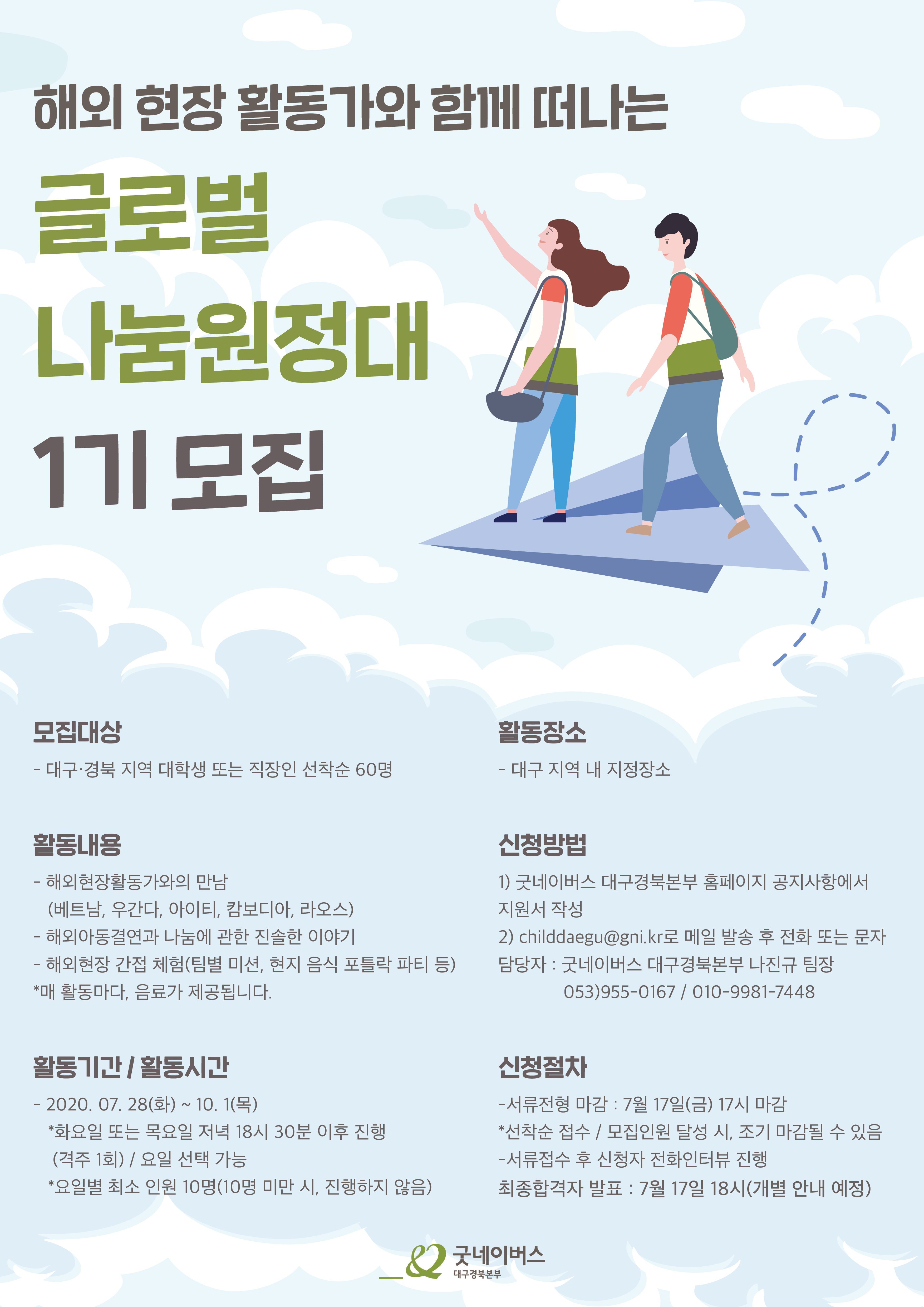 2020 굿네이버스 글로벌나눔원정대 1기 모집작성자 : 나진규 작성일 : 20-07-02