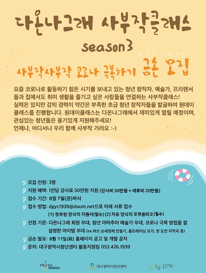 2020 다온나그래 사부작클래스 SEASON.3 에 함께 할 금손을 찾습니다!작성자 : 관리자 작성일 : 20-07-23 대구광역시청년센터