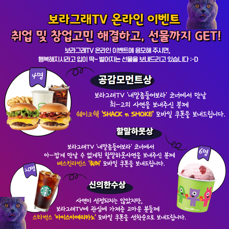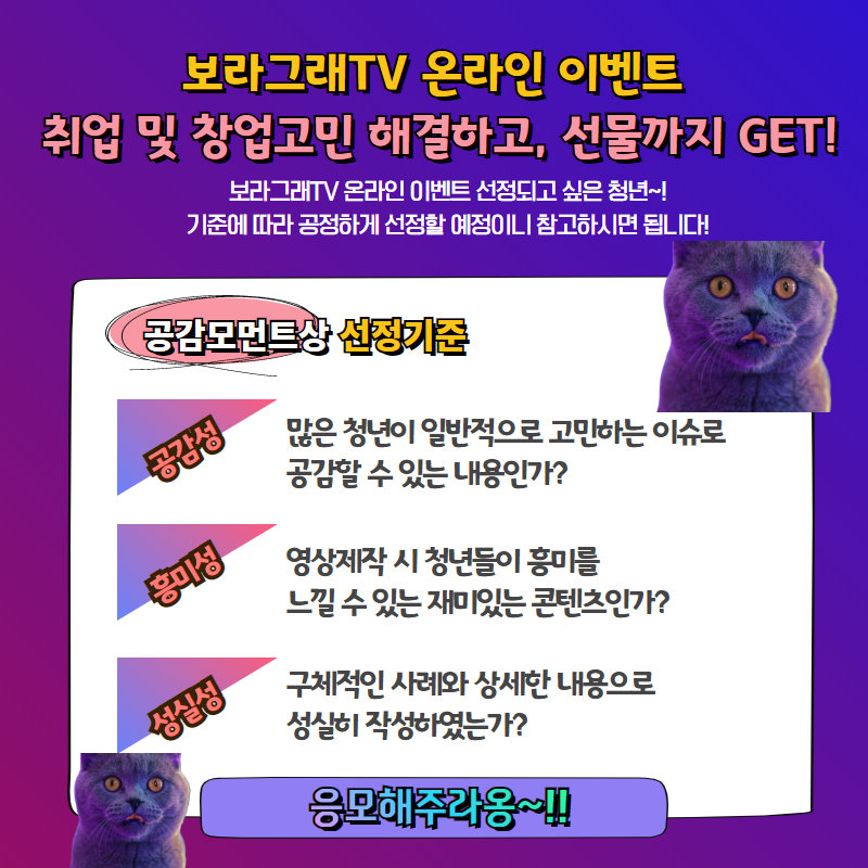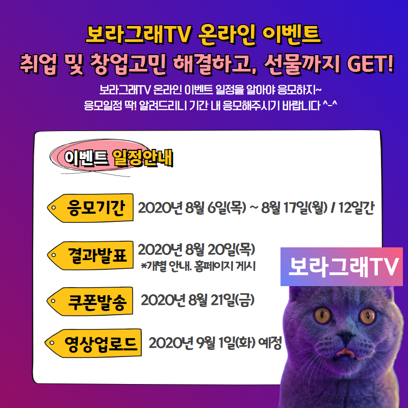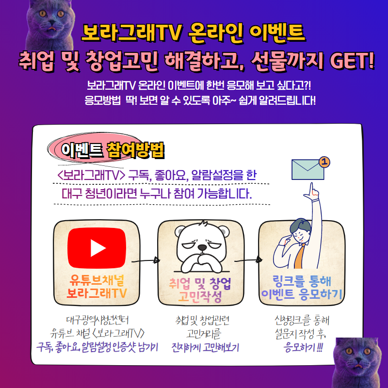 2020 보라그래TV 온라인 이벤트(내말좀들어보라_취업 및 창업 편)작성자 : 젊프 작성일 : 20-08-06 대구광역시청년센터
