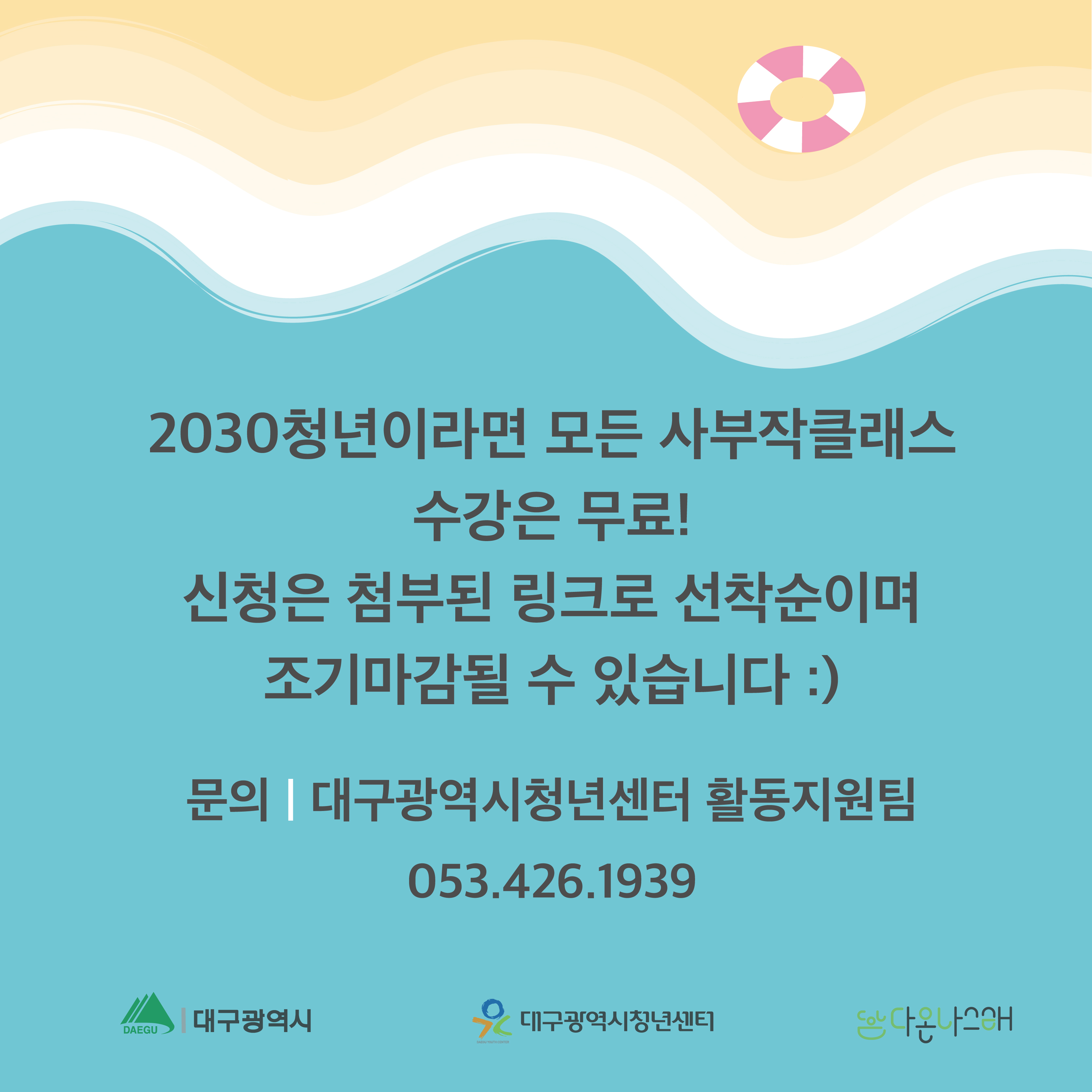 2020 다온나그래 기획프로그램<사부작클래스 시즌3> 수강생 모집 공고작성자 : 관리자 작성일 : 20-08-12 대구광역시청년센터