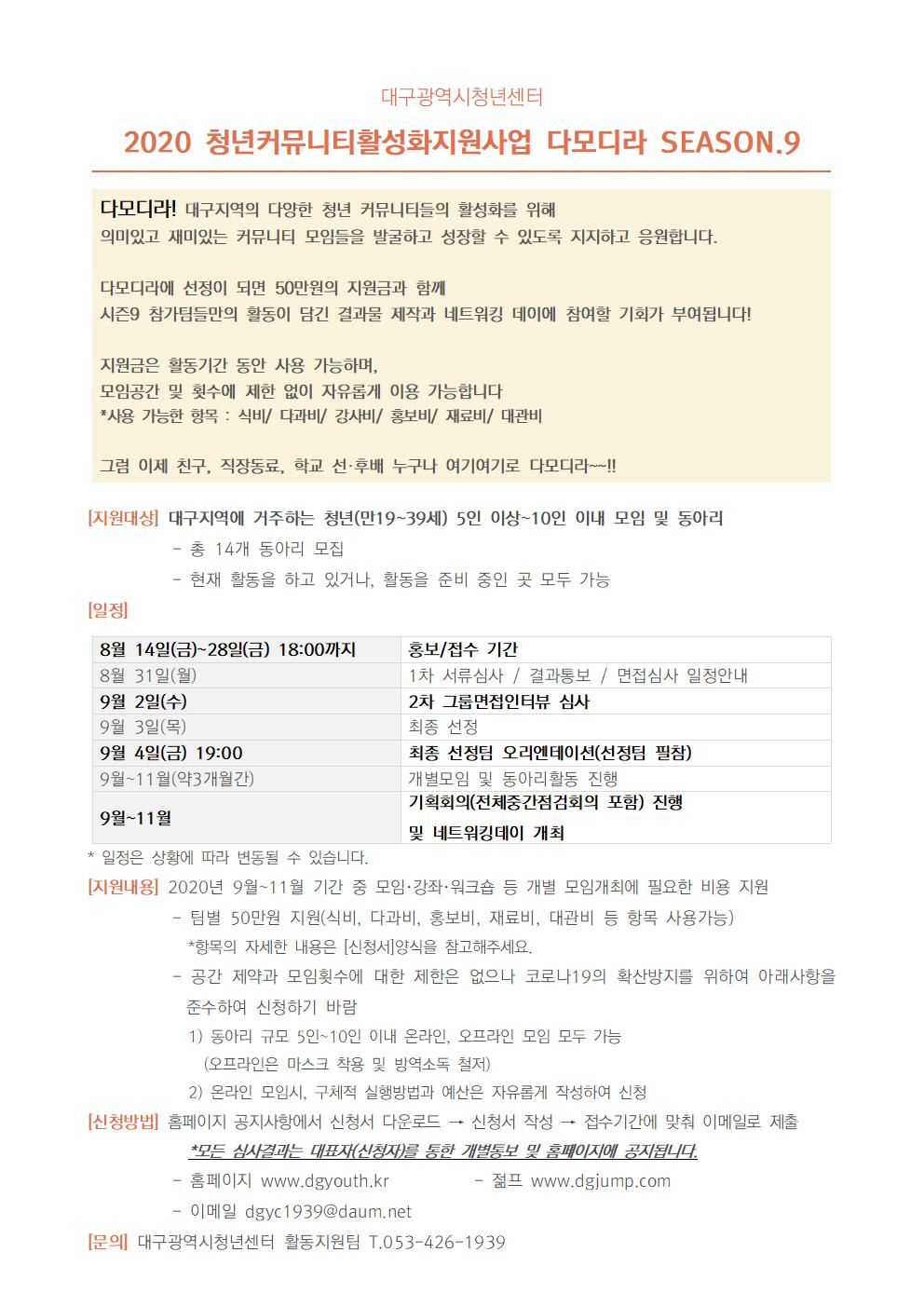 2020 청년커뮤니티활성화프로젝트 <다모디라 시즌9> 모집공고작성자 : 관리자 작성일 : 20-08-14 대구광역시청년센터