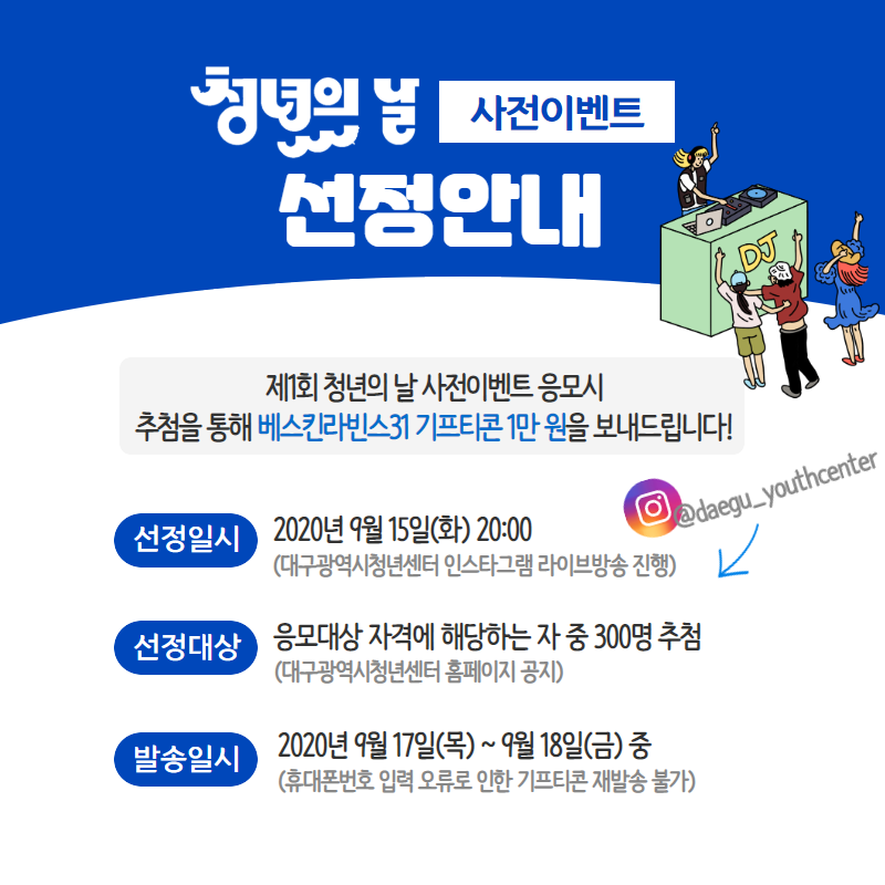 - 선정일시: 2020년 9월 15일(화) 20:00 *대구광역시청년센터 인스타그램 라이브 방송 진행