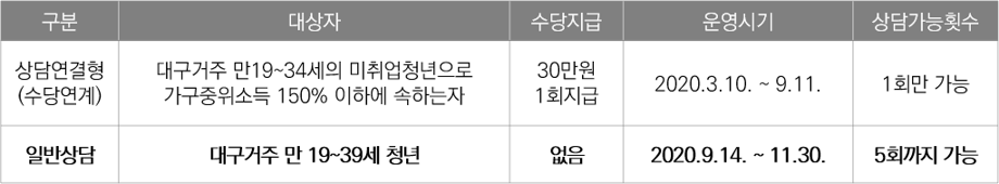 2020 청년상담소 일반상담 참여 모집작성자 : 젊프 작성일 : 20-09-01 대구광역시청년센터