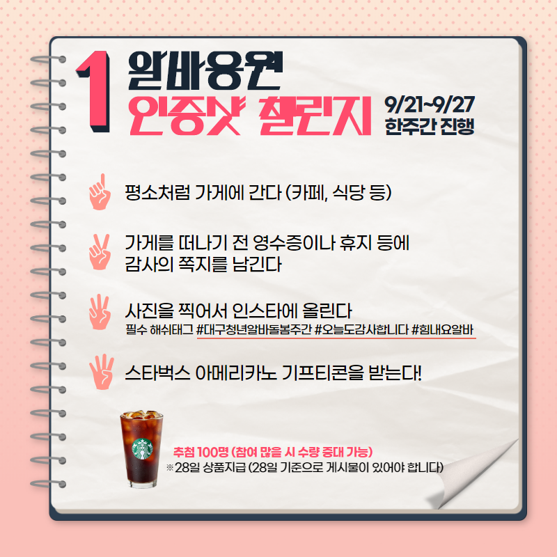 1) 알바응원 인증샷 챌린지 : 아르바이트 청년에게 감사 쪽지 남기고 인증샷 찍어 '인스타그램'에 올리기