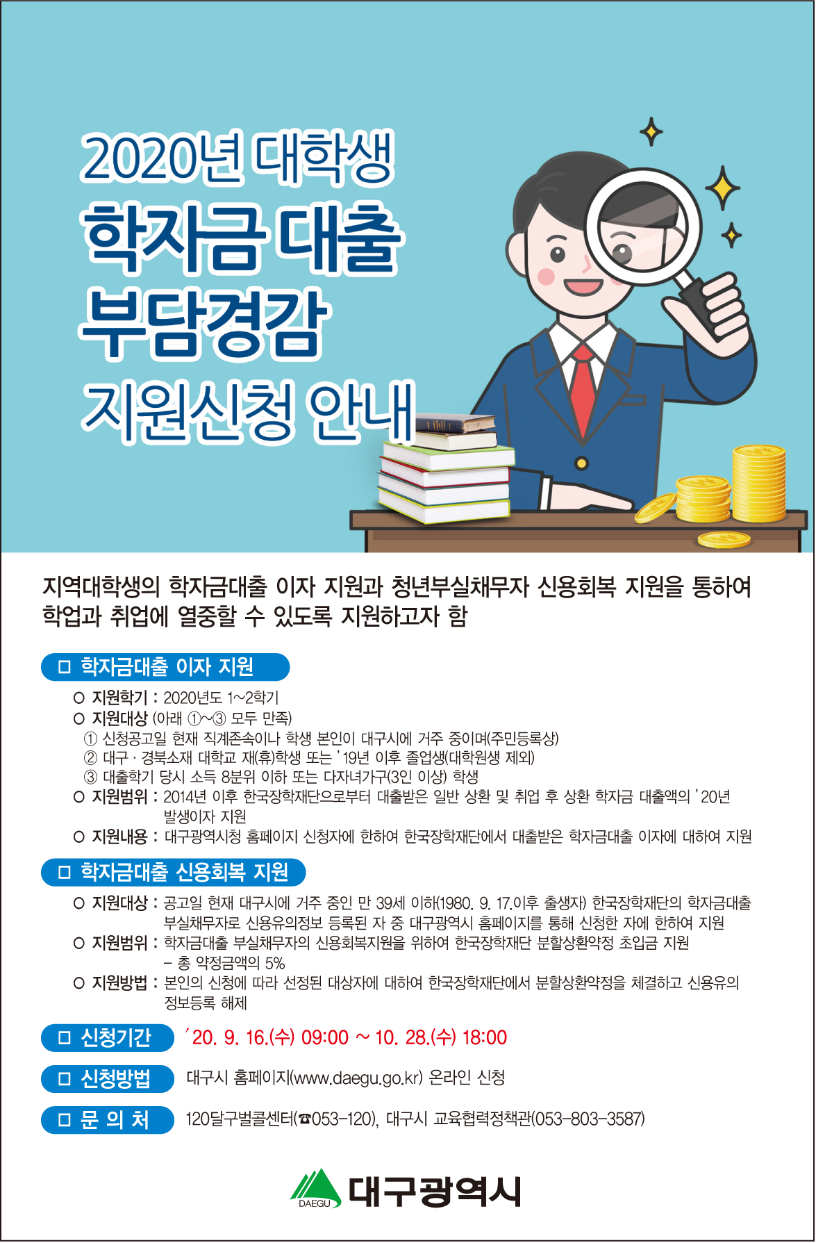 1. 지원대상 : 공고일 현재 대구시에 주민등록을 둔 만 39세 이하 한국장학재단의 학자금대출 부실채무자로