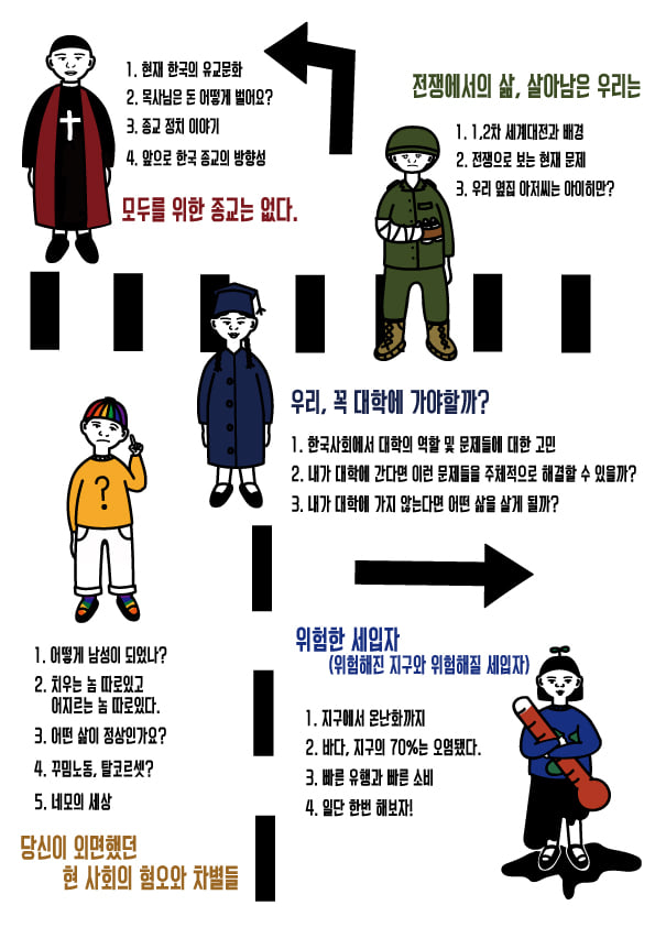 저희 방가반가반은 6학년 2학기 교육과정으로 사회라는 주제에 맞춰 “라떼는 이랬으면 좋겠어”라는 인문학 캠프를 진행합니다. 앞으로 마주해야할 사회 안, 관심 주제를 중심으로 종교, 역사, 페미니즘, 환경이라는 키워드를 선정했고, 준비과정 중 청년하다(동덕여대)에서 대안교육과 현재 입시제도에 대하여 문제점을 나누고 싶다 제안을 주셔서 함께 하게되었습니다. 사회로 나가기 전,이슈가 되고 있는 사회 문제에 대해 서로의 생각을 나누고, 여러방면으로 도움이 되는 시간이 되었으면 합니다. 코로나19 때문에 많은 사람들과 만나 이야기를 나누지 못하게 되었지만, 최대한 안전한 환경으로 진행하려 하니 많은 참여 부탁드립니다.