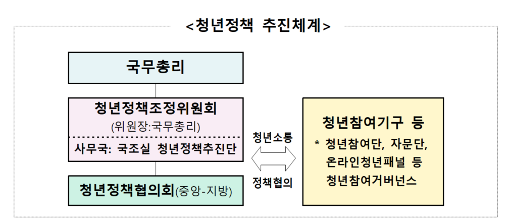 ㅇ 청년정책에 관한 사항을 심의·조정하기 위해 국무총리 소속으로 청년정책조정위원회(위원장 국무총리)를 두고, 국무조정실에 사무국 설치