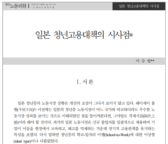 법령정보 / 연구자료 [ 연구자료 ] 일본 청년고용대책의 시사점 - 이승렬(2011, 고려대학교) 작성자 : 이재호 작성일 : 18-07-29 원문보기 : https://www.kli.re.kr/kli/downloadPodFile.do?pdicalOrginlDwldNo=2207 첨부파일 1-3 특집_이승렬.pdf 목록 이전글 다음글