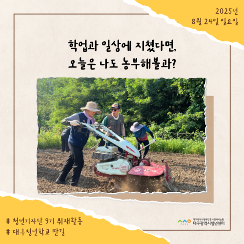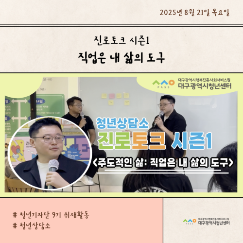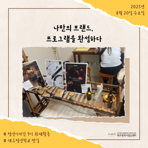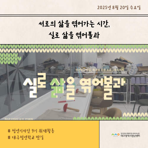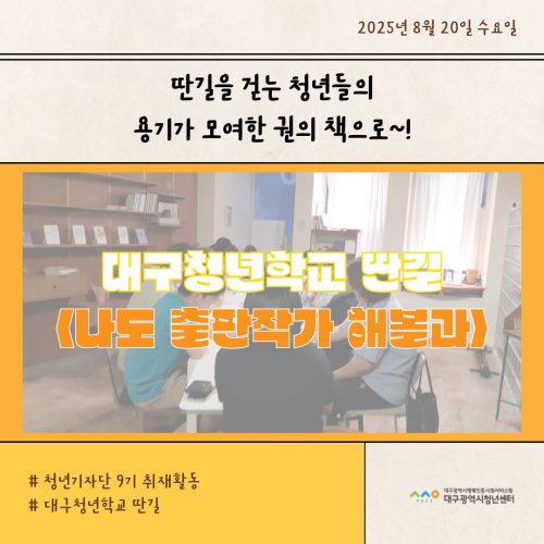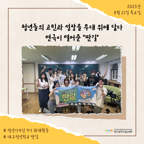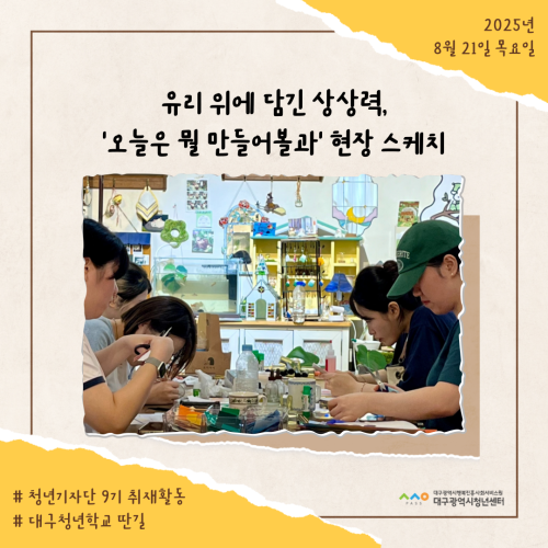 청년기자단이간다 리포트스크랩 청년기자단 소개 검색 청년기자단등록 구분 : 카테고리 전체 2026 2025 2024 2023 2022 2021 2020 2019 기간 설정 전체선택 전체 : 908 (10/114 page) [대구청년학교 딴길] 지구를 관찰해볼과?! [대구청년학교 딴길] 청년들의 고민과 성장을 무대 위에 담다 [대구청년학교 딴길] 학업과 일상에 지쳤다면, 오늘은 나도 농부해볼과? [청년상담소] 진로토크 시즌1_직업은 내 삶의 도구 [대구청년학교 딴길] 유리 위에 담긴 상상력, ‘오늘은 뭘 만들어 볼과’ 현장 스케치 [대구청년학교 딴길] 딴길을 걷는 청년들의 용기가 모여 한권의 책으로! [대구청년학교 딴길] 서로의 삶을 엮어가는 시간, 실로 삶을 엮어볼과 [대구청년학교 딴길] 나만의 브랜드, 프로그램을 완성하다 1 2 3 4 5 6 7 8 9 10