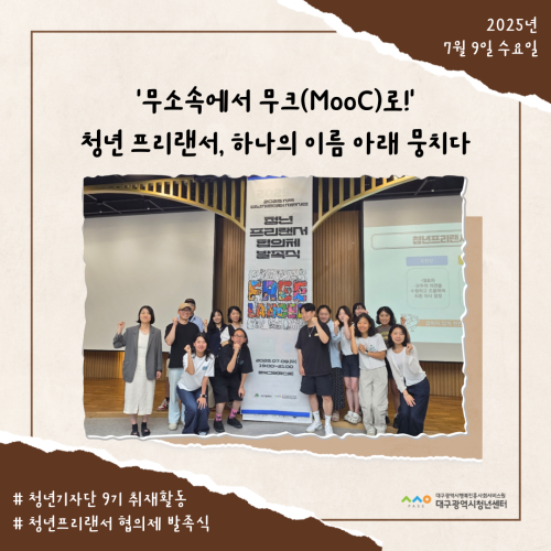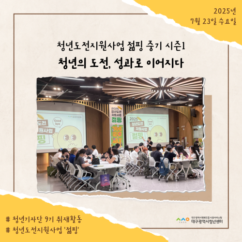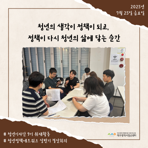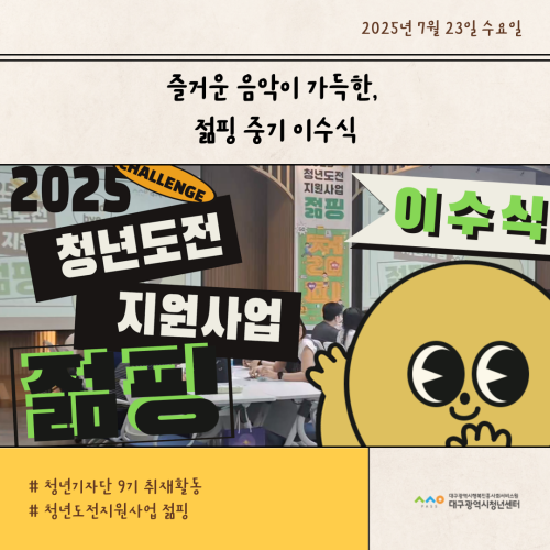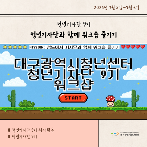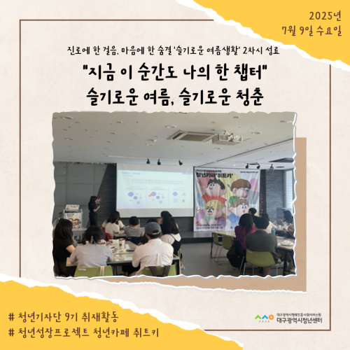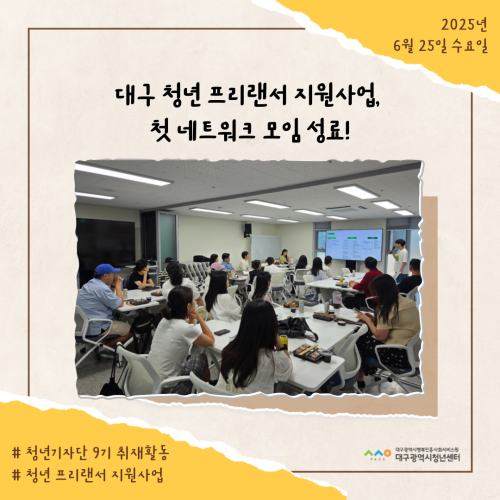 청년기자단이간다 리포트스크랩 청년기자단 소개 검색 청년기자단등록 구분 : 카테고리 전체 2026 2025 2024 2023 2022 2021 2020 2019 기간 설정 전체선택 전체 : 908 (12/114 page) [청년정책네트워크] 청년의 생각이 정책이 되고, 정책이 다시 청년의 삶에 닿는 순간 [청년도전지원사업 젊핑] 즐거운 음악이 가득한, 젊핑 중기 이수식 [청년도전지원사업 젊핑] 청년의 도전, 성과로 이어지다! [청년프리랜서지원사업] 대구 청년 프리랜서 지원사업, 첫 네트워크 모임 성료! [청년학교 딴길] 입학식: ‘제 길’을 찾아 나서는 청년들의 ‘딴 길’ [청년프리랜서협의체] ‘무소속에서 무크(MooC)로!’ 청년 프리랜서, 하나의 이름 아래 뭉치다. [청년성장프로젝트_취트키]“지금 이 순간도 나의 한 챕터” 슬기로운 여름, 슬기로운 청춘 [청년기자단 9기] 청년기자단과 함께 워크숍 즐기기 11 12 13 14 15 16 17 18 19 20