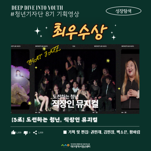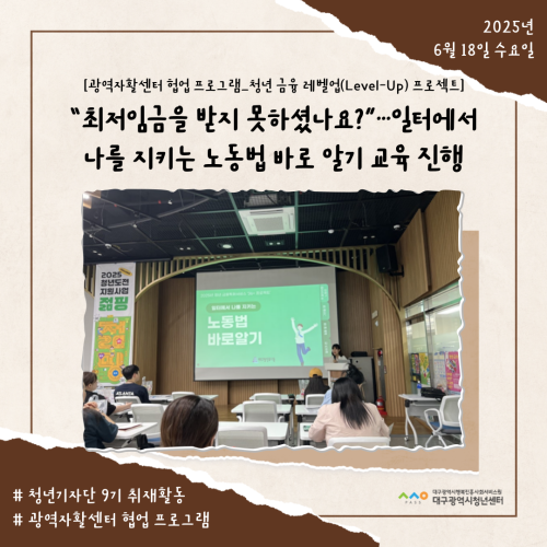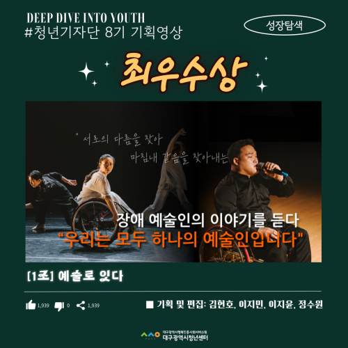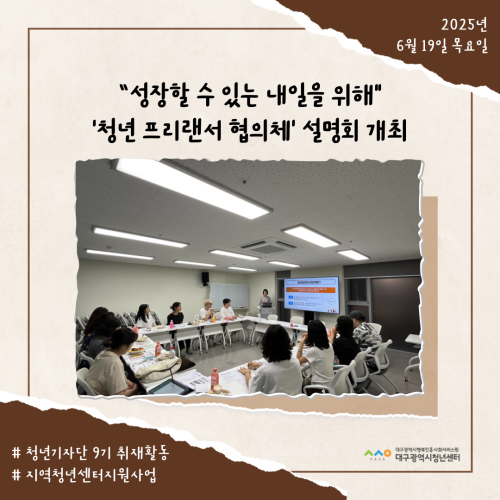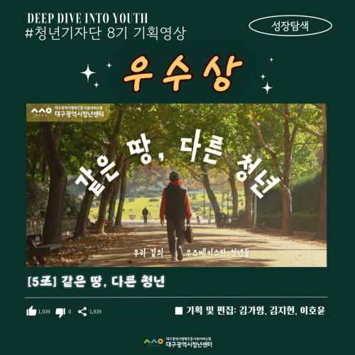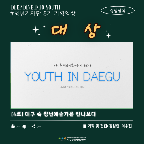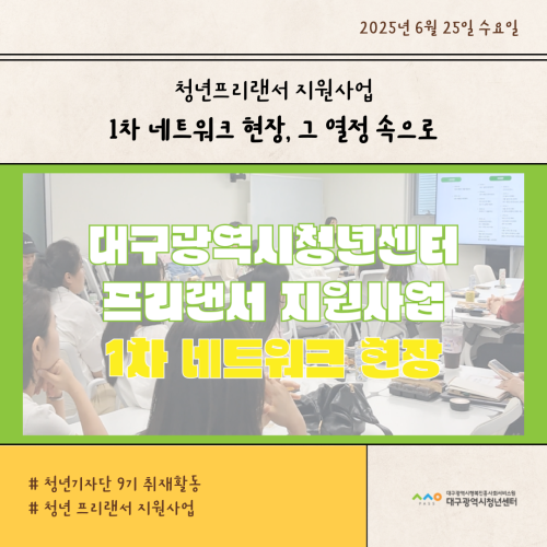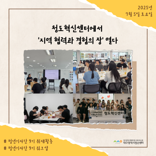 청년기자단이간다 리포트스크랩 청년기자단 소개 검색 청년기자단등록 구분 : 카테고리 전체 2026 2025 2024 2023 2022 2021 2020 2019 기간 설정 전체선택 전체 : 908 (13/114 page) [청년기자단 9기] 청도혁신센터서 ‘지역 협력과 경험의 장’ 열다 프리랜서 지원사업 1차 네트워크 현장, 그 열정 속으로 “성장할 수 있는 내일을 위해” 대구광역시청년센터, ‘청년프리랜서 협의체’ 설명회 개최 [광역자활센터 협업 프로그램_청년 금융 레벨업(Level-Up) 프로젝트] “최저임금을 받지 못하셨나요?”···일터에서 나를 지키는 노동법 바로 알기 교육 진행 [기획영상_대상] 대구 속 청년예술가를 만나보다 [기획영상_최우수상] 예술로 잇다 [기획영상_최우수상] 도전하는 청년, 직장인 뮤지컬 [기획영상_우수상] 같은 땅, 다른 청년 11 12 13 14 15 16 17 18 19 20