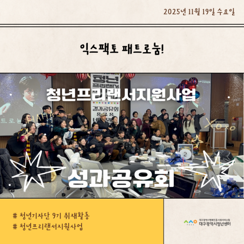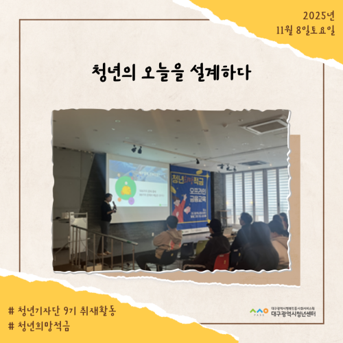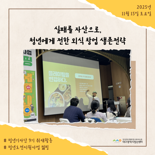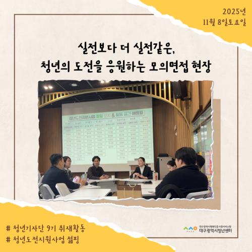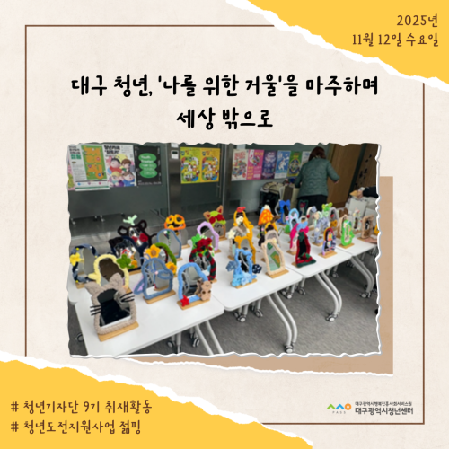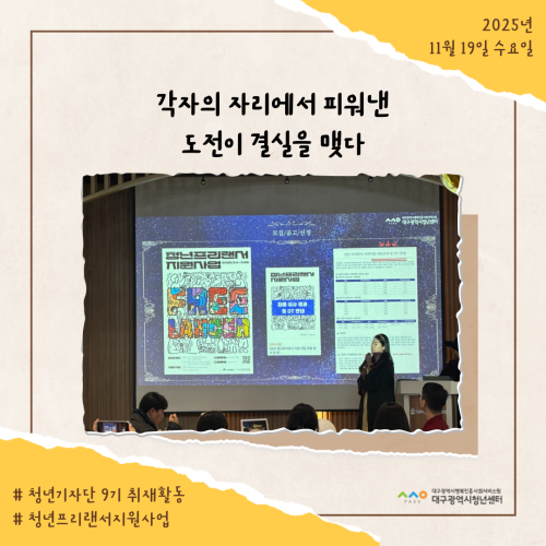 청년기자단이간다 리포트스크랩 청년기자단 소개 검색 청년기자단등록 구분 : 카테고리 전체 2026 2025 2024 2023 2022 2021 2020 2019 기간 설정 전체선택 전체 : 908 (3/114 page) [청년프리랜서지원사업] 각자의 자리에서 피워낸 도전이 결실을 맺다 [청년프리랜서지원사업] 성과공유회~익스팩토 패트로눔! [청년도전지원사업 젊핑] 선을 그리고 색을 더하며, 나를 발견하다 [청년도전지원사업 젊핑] 실패를 자산으로… 청년에게 전한 외식 창업 생존전략 [청년도전지원사업 젊핑] 대구 청년, ‘나를 위한 거울’을 마주하며 세상 밖으로… [청년도전지원사업 젊핑] '나를 어떻게 보여줄까?' 청년 40명이 찾은 이미지의 답 [청년도전지원사업 젊핑] ‘실전보다 더 실전 같은’… 청년의 도전을 응원하는 모의면접 현장 [청년희망적금] 청년의 오늘을 설계하다 1 2 3 4 5 6 7 8 9 10