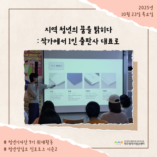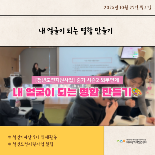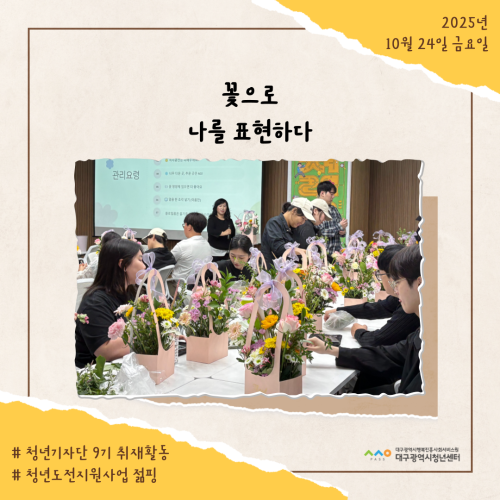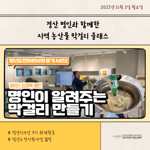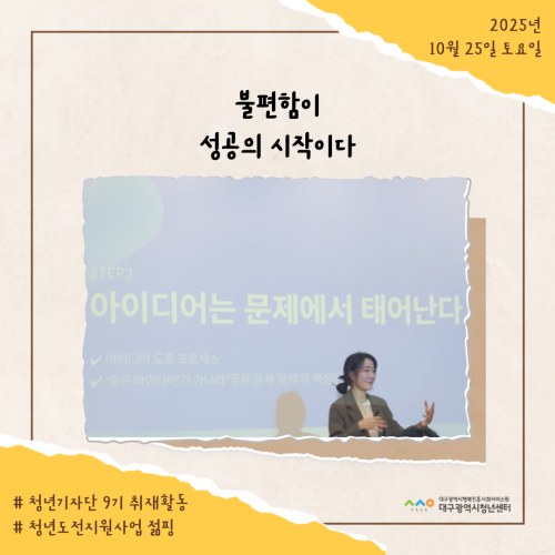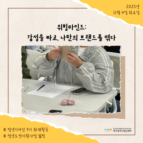 청년기자단이간다 리포트스크랩 청년기자단 소개 검색 청년기자단등록 구분 : 카테고리 전체 2026 2025 2024 2023 2022 2021 2020 2019 기간 설정 전체선택 전체 : 908 (4/114 page) [청년도전지원사업 젊핑] ‘무드등만들기‘를 통해 새로운 꿈을 꾸다! [청년도전지원사업 젊핑] 위빙마인드: 감성을 짜고, 나만의 브랜드를 엮다 [청년도전지원사업 젊핑] 경산 명인과 함께한 지역 농산물 막걸리 클래스 [청년도전지원사업 젊핑] 내 얼굴이 되는, 명함 만들기 [청년도전지원사업 젊핑] 불편함이 성공의 시작이다 [청년도전지원사업 젊핑] 꽃으로 나를 표현하다 [청년상담소]지역 청년의 꿈을 밝히다 : 작가에서 1인 출판사 대표로 \\youth_happy\youth_happy\126_청년기자단\108_리포트 1 2 3 4 5 6 7 8 9 10