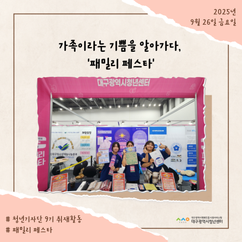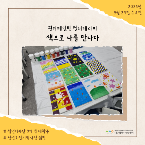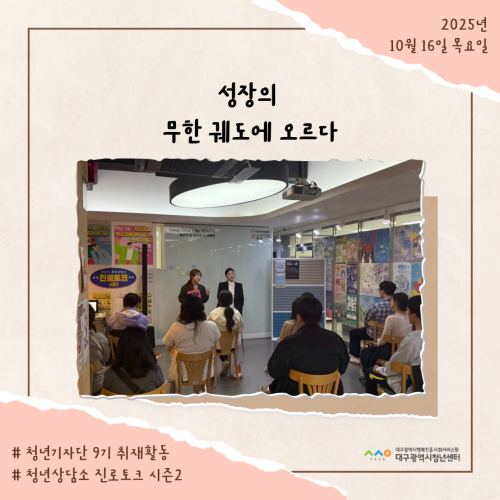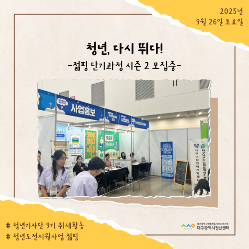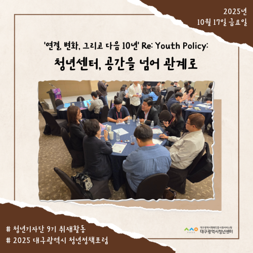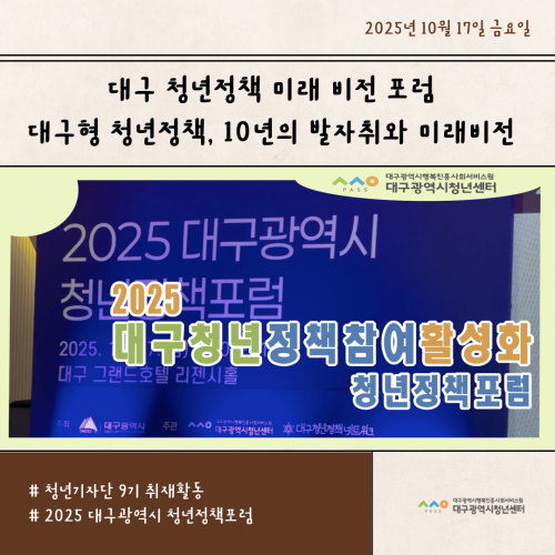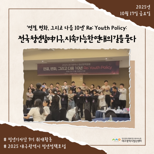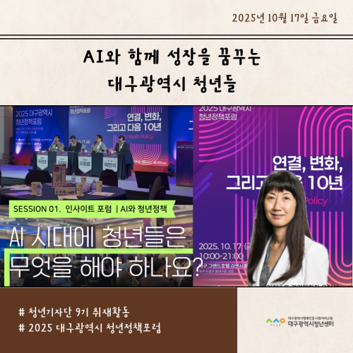 청년기자단이간다 리포트스크랩 청년기자단 소개 검색 청년기자단등록 구분 : 카테고리 전체 2026 2025 2024 2023 2022 2021 2020 2019 기간 설정 전체선택 전체 : 908 (6/114 page) [청년정책포럼] 전국 청년참여기구, 지속 가능한 연대의 길을 묻다. [청년정책포럼] 청년센터, 공간을 넘어 관계로 [청년정책포럼] SESSION2. 대구 청년정책 미래비전포럼 [청년정책포럼] AI와 함께 성장을 꿈꾸는 대구광역시 청년들 [청년상담소] 성장의 무한궤도에 오르다 [청년도전지원사업 젊핑] 청년, 다시 뛰다! 점핑(Jumping) 단기 과정 시즌2 모집 [청년기자단] 가족이라는 기쁨을 알아가다, '패밀리 페스타' [청년도전지원사업 젊핑] 색으로 나를 만나다 1 2 3 4 5 6 7 8 9 10