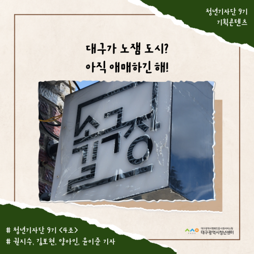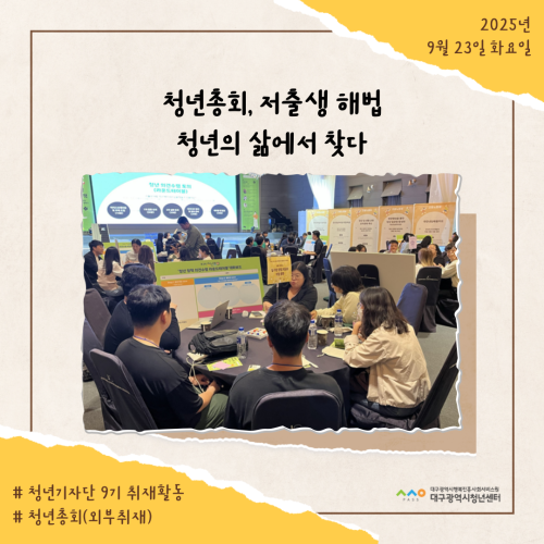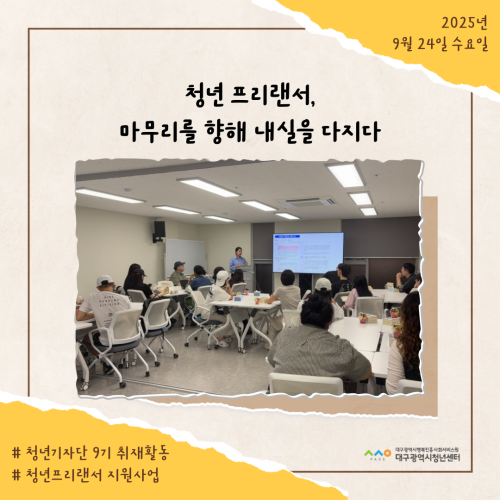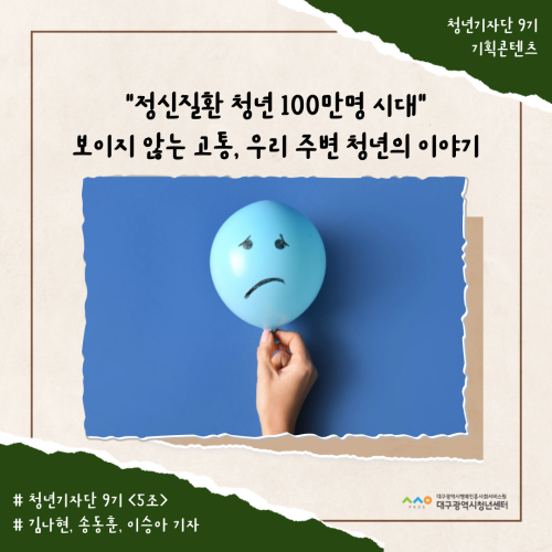 청년기자단이간다 리포트스크랩 청년기자단 소개 검색 청년기자단등록 구분 : 카테고리 전체 2026 2025 2024 2023 2022 2021 2020 2019 기간 설정 전체선택 전체 : 908 (7/114 page) [청년프리랜서 지원사업] 청년 프리랜서, 마무리를 향해 [청년기자단] 청년총회, 저출생 해법 청년의 삶에서 찾다 [기획콘텐츠] 어르신, 야자타임 가져요!! [기획콘텐츠] 쉬는 시간도 근무시간에 포함되나요? [기획콘텐츠] 대구 서문지구대, 치안 최전선에서 시민의 하루를 지킨다 [기획콘텐츠] “정신질환 청년 100만 명 시대”... 보이지 않는 고통, 우리 주변 청년의 이야기 [기획콘텐츠] 대구가 노잼 도시? 아직 애매하긴 해! [기획콘텐츠] 내 집 첫걸음 in 대구 1 2 3 4 5 6 7 8 9 10