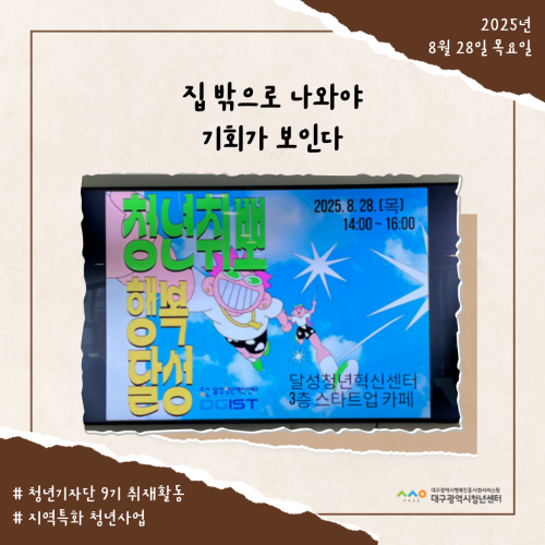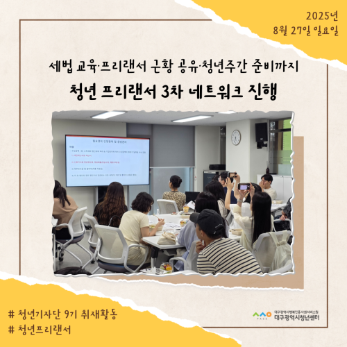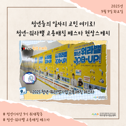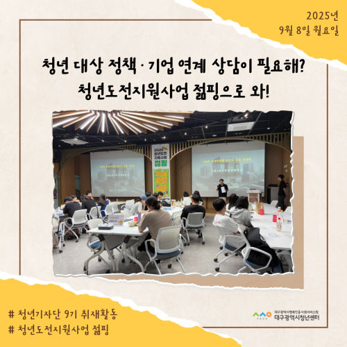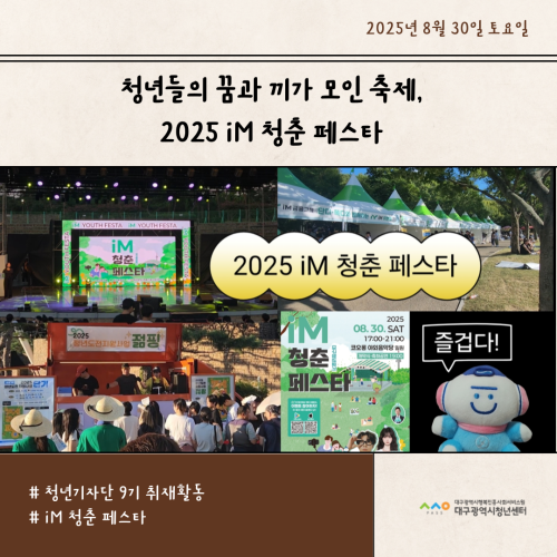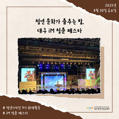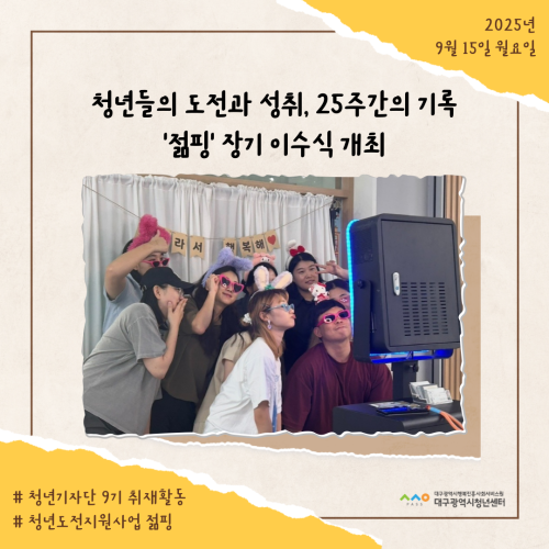 청년기자단이간다 리포트스크랩 청년기자단 소개 검색 청년기자단등록 구분 : 카테고리 전체 2026 2025 2024 2023 2022 2021 2020 2019 기간 설정 전체선택 전체 : 908 (9/114 page) [청년도전지원사업 젊핑] 청년들의 도전과 성취, 25주간의 기록… ‘젊핑’ 이수식 개최 [청년기자단] 청년-워라밸 고용매칭페스타 현장스케치 [청년도전지원사업 젊핑] 청년 대상 정책 ·기업 연계 상담 행사 진행 청년의 꿈과 끼가 모인 축제, iM청춘 페스타 [iM 청춘 페스타] 청년 문화가 춤추는 밤 [지역특화 청년사업] 집 밖으로 나와야 기회가 보인다 [지역특화 청년사업] 상상을 현실로! 나만의 터프팅 작품 만들기 [청년프리랜서 지원사업] 청년 프리랜서 3차 네트워크 모임 진행 1 2 3 4 5 6 7 8 9 10