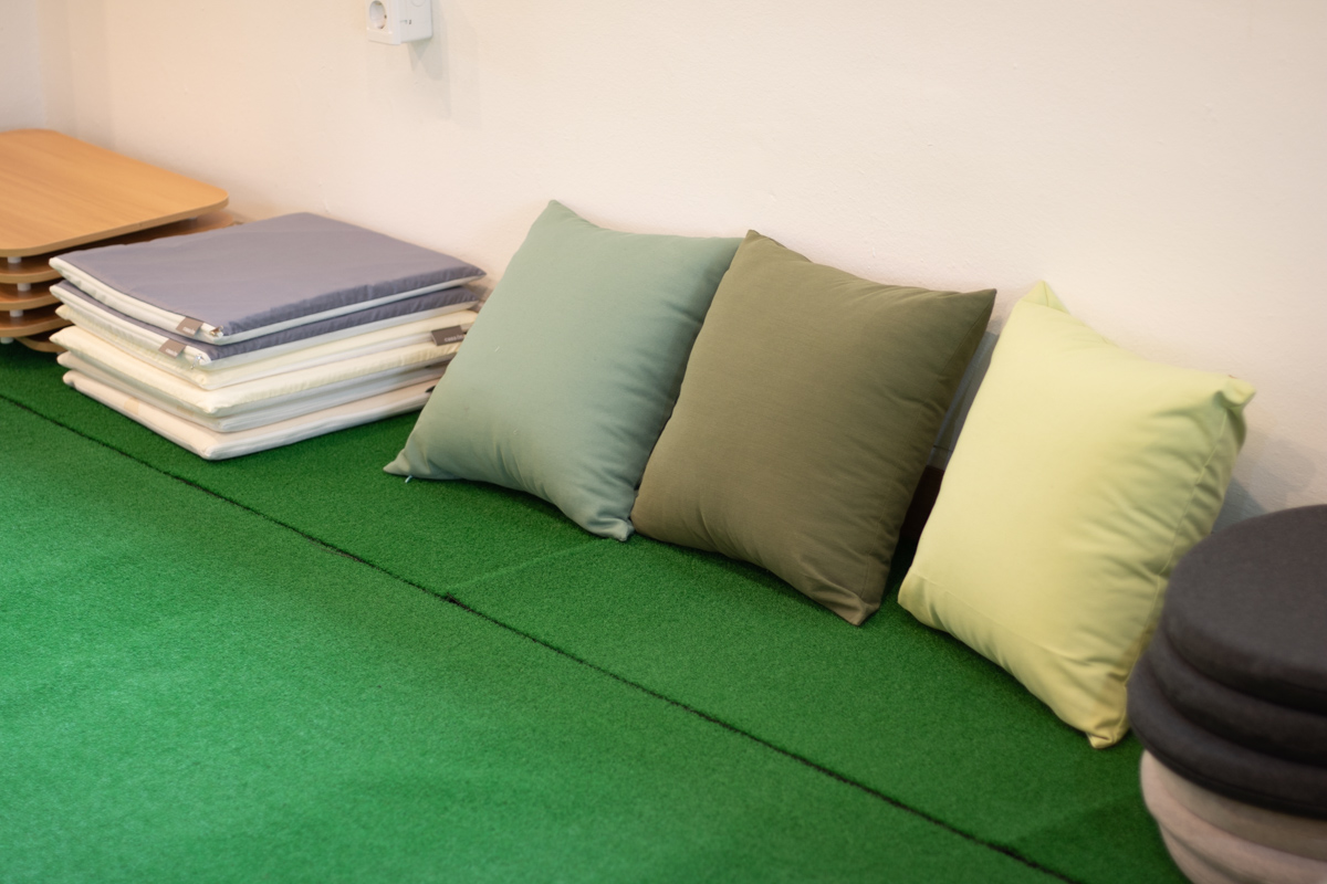 빈백, 캠핑의자, 쿠션, 방석이 비치되어 있어 휴식할 수 있는 공간
