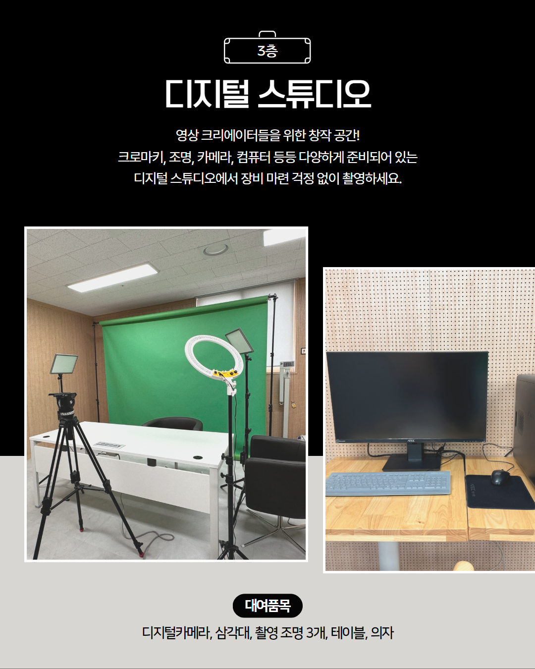 3층 디지털스튜디오 : 면접 영상 촬영, 사진 촬영 등 디지털 크리에이터를 위한 공간 (조명, 삼각대, 카메라 장비 이용 가능)