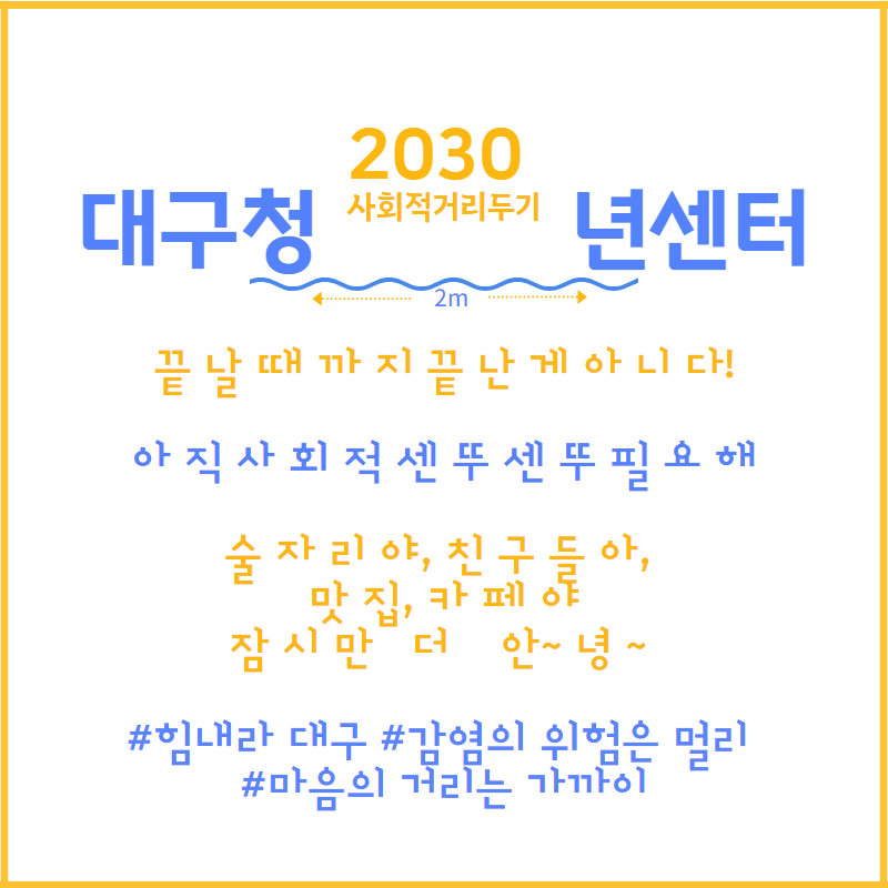 공지/토크게시판 공지사항 토크게시판 대구광역시청년센터 사회적거리두기캠페인 작성자 : 젊프 작성일 : 20-04-02 아직은 사회적 센스가 필요하다!서로를 지키는 거-------------리 2m 유지해주세요 #함께해요 #사회적거리두기 #코로나19 전체 댓글수 (0) 목록